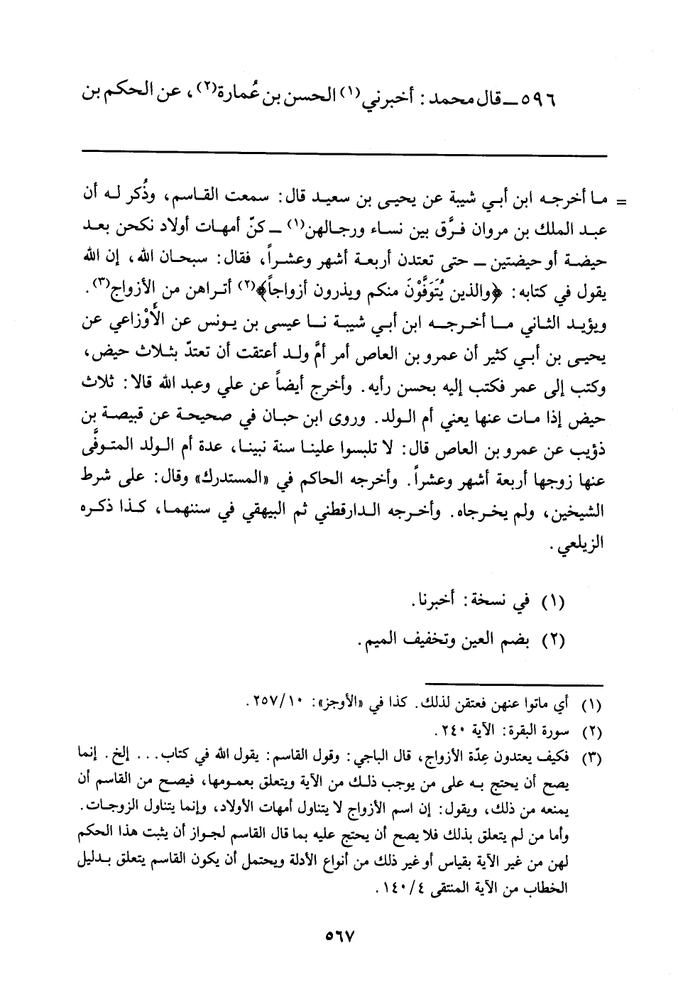 ما أخرجه ابن أبي شيبة عن يحيى بن سعيد قال: سمعت القاسم، وذُكر له أن عبد الملك بن مروان فرَّق بين نساء ورجالهن (أي ماتوا عنهن فعتقن لذلك. كذا في "الأوجز": 10/257) - كنّ أمهات أولاد نكحن بعد حيضة أو حيضتين - حتى تعتدن أربعة أشهر وعشراً، فقال: سبحان الله، إن الله يقول في كتابه: {والذين يُتَوَفَّوْنَ منكم ويذرون أزواجاً} (سورة البقرة: الآية 240) أتراهن من الأزواج (فكيف يعتدون عِدّة الأزواج، قال الباجي: وقول القاسم: يقول الله في كتاب ... إلخ. إنما يصح أن يحتج به على من يوجب ذلك من الآية ويتعلق بعمومها، فيصح من القاسم أن يمنعه من ذلك، ويقول: إن اسم الأزواج لا يتناول أمهات الأولاد، وإنما يتناول الزوجات. وأما من لم يتعلق بذلك فلا يصح أن يحتج عليه بما قال القاسم لجواز أن يثبت هذا الحكم لهن من غير الآية بقياس أو غير ذلك من أنواع الأدلة ويحتمل أن يكون القاسم يتعلق بدليل الخطاب من الآية. المنتقى 4/140) . ويؤيد الثاني ما أخرجه ابن أبي شيبة نا عيسى بن يونس عن الأَوْزاعي عن يحيى بن أبي كثير أن عمرو بن العاص أمر أمَّ ولد أعتقت أن تعتدّ بثلاث حيض، وكتب إلى عمر فكتب إليه بحسن رأيه. وأخرج أيضاً عن علي وعبد الله قالا: ثلاث حيض إذا مات عنها يعني أم الولد. وروى ابن حبان في صحيحه عن قبيصة بن ذؤيب عن عمرو بن العاص قال: لا تلبسوا علينا سنة نبينا، عدة أم الولد المتوفَّى عنها زوجها أربعة أشهر وعشراً. وأخرجه الحاكم في "المستدرك" وقال: على شرط الشيخين، ولم يخرجاه. وأخرجه الدارقطني ثم البيهقي في سننهمها، كذا ذكره الزيلعي.