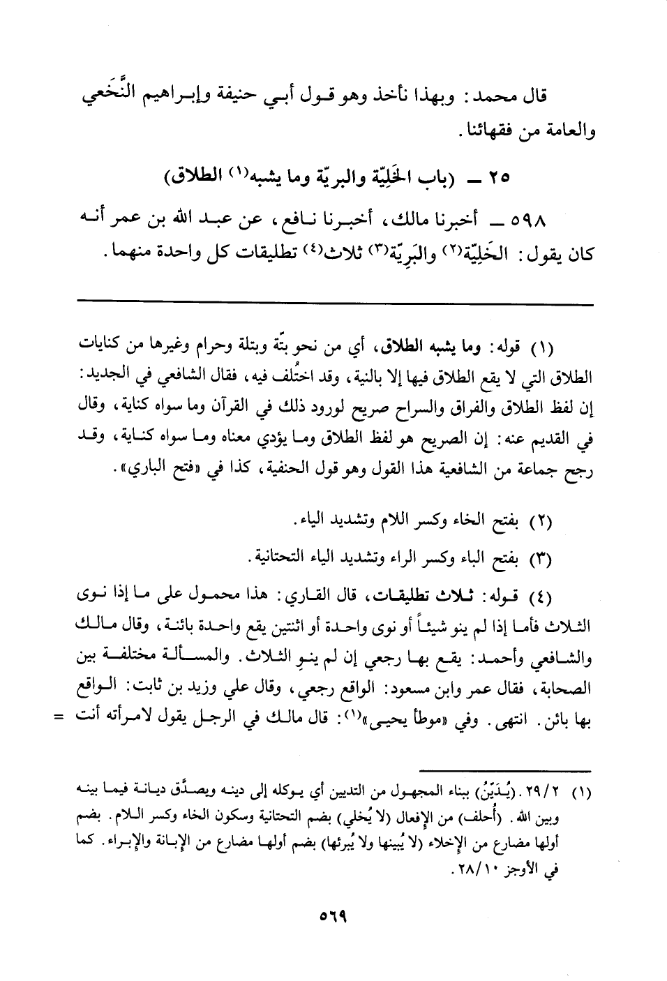 598 - أَخْبَرَنَا مَالِكٌ، أَخْبَرَنَا نَافِعٌ، عَنْ عَبْدِ اللَّهِ بْنِ عُمَرَ أَنَّهُ كَانَ يَقُولُ: الخَلِيّة (¬2) والبَرِيّة (¬3) ثَلاثُ (¬4) تَطْلِيقَاتٍ كل واحدة منهما.