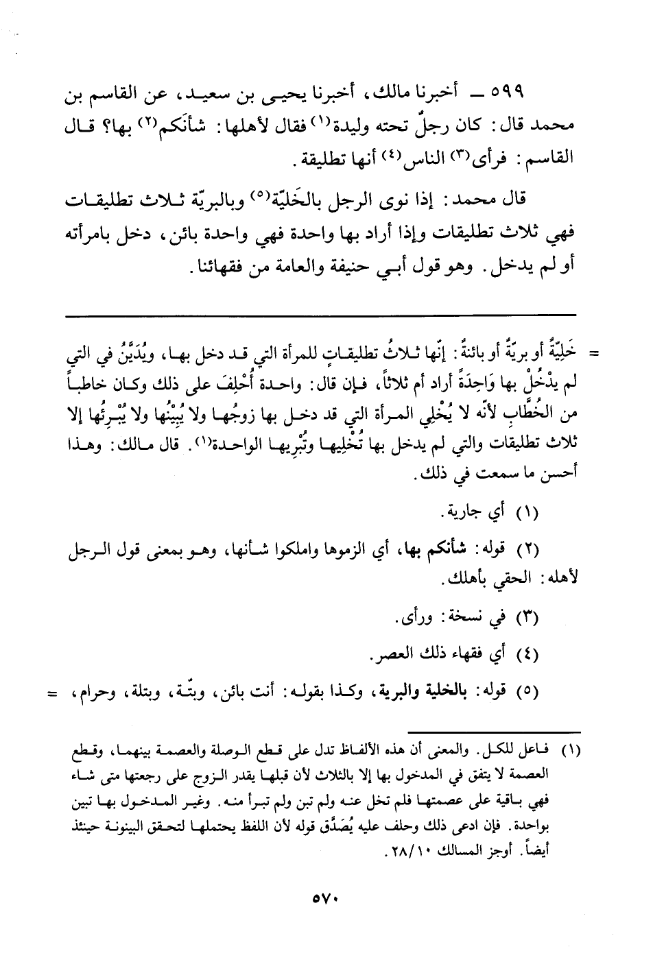 599 - أَخْبَرَنَا مَالِكٌ، أَخْبَرَنَا يَحْيَى بْنُ سَعِيدٍ، عَنِ الْقَاسِمِ بْنِ مُحَمَّدٍ قَالَ: كَانَ رجلٌ تَحْتَهُ وَلِيدَةٌ (¬1) فَقَالَ لأَهْلِهَا: شأنَكم (¬2) بِهَا؟ قَالَ الْقَاسِمُ: فَرَأَى (¬3) النَّاسُ (¬4) أَنَّهَا تَطْلِيقَةٌ.