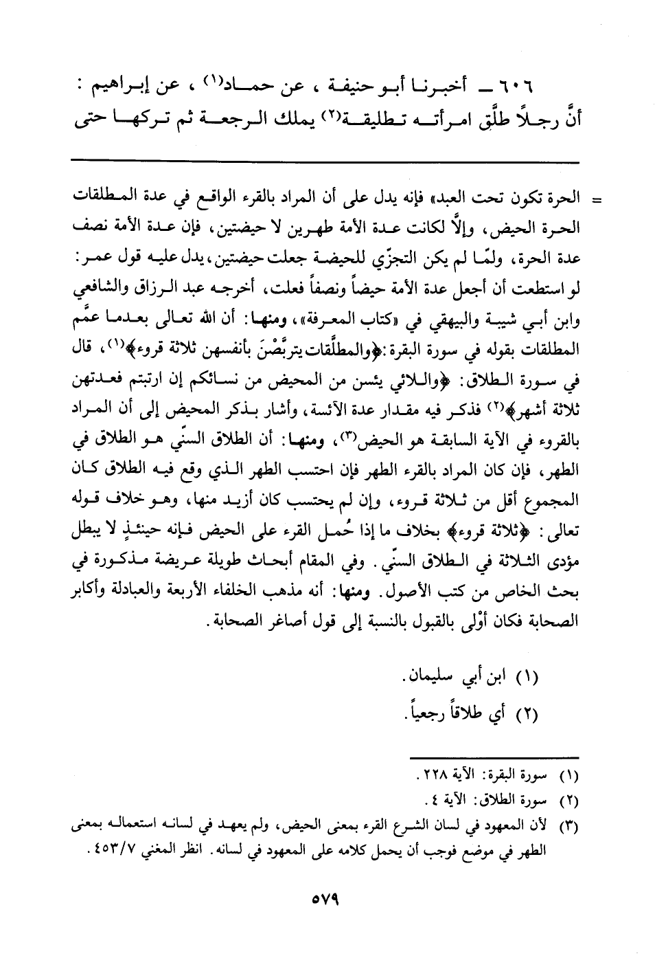 الحرة تكون تحت العبد" فإنه يدل على أن المراد بالقرء الواقع في عدة المطلقات الحرة الحيض، وإلاَّ لكانت عدة الأمة طهرين لا حيضتين، فإن عدة الأمة نصف عدة الحرة، ولمّا لم يكن التجزّي للحيضة جعلت حيضتين، يدل عليه قول عمر: لو استطعت أن أجعل عدة الأمة حيضاً ونصفاً فعلت، أخرجه عبد الرزاق والشافعي وابن أبي شيبة والبيهقي في"كتاب المعرفة"، ومنها: أن الله تعالى بعد ما عمَّم المطلقات بقوله في سورة البقرة: {والمطلَّقات يتربَّصنَ بأنفسهن ثلاثة قروء} (سورة البقرة: الآية 228) ، قال في سورة الطلاق: {واللائي يئسن من المحيض من نسائكم إن ارتبتم فعدتهن ثلاثة أشهر} (سورة الطلاق: الآية 4) ، فذكر فيه مقدار عدة الآيسة، وأشار بذكر المحيض إلى أن المراد بالقروء في الآية السابقة هو الحيض (لأن المعهود في لسان الشرع القرء بمعنى الحيض، ولم يعهد في لسانه استعماله بمعنى الطهر في موضع فوجب أن يحمل كلامه على المعهود في لسانه. انظر المغني 7/453) ، ومنها: أن الطلاق السنّي هو الطلاق في الطهر، فإن كان المراد بالقرء الطهر فإن احتسب الطهر الذي وقع فيه الطلاق كان المجموع أقل من ثلاثة قروء، وإن لم يحتسب كان أزيد منها، وهو خلاف قوله تعالى: {ثلاثة قروء} بخلاف ما إذا حُمل القرء على الحيض فإنه حينئذٍ لا يبطل مؤدى الثلاثة في الطلاق السنّي. وفي المقام أبحاث طويلة عريضة مذكورة في بحث الخاص من كتب الأصول. ومنها: أنه مذهب الخلفاء الأربعة والعبادلة وأكابر الصحابة فكان أولى بالقبول بالنسبة إلى قول أصاغر الصحابة.