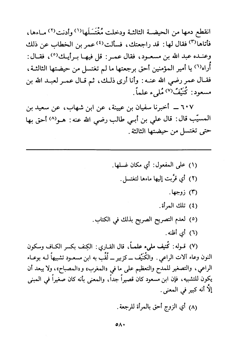 انْقَطَعَ دَمُهَا مِنَ الْحَيْضَةِ الثَّالِثَةِ وَدَخَلَتْ مُغْتَسَلَها (¬1) وَأَدْنَتْ (¬2) مَاءَهَا، فَأَتَاهَا (¬3) فَقَالَ لَهَا: قَدْ رَاجَعْتُكِ، فَسَأَلَتْ (¬4) عُمَرَ بْنَ الْخَطَّابِ عَنْ ذَلِكَ وَعِنْدَهُ عَبْدُ اللَّهِ بْنُ مَسْعُودٍ، فَقَالَ عُمَرُ: قُلْ فِيهَا بِرَأْيِكَ (¬5) ، فَقَالَ: أُراه (¬6) يَا أَمِيرَ الْمُؤْمِنِينَ أَحَقَّ بِرَجْعَتِهَا مَا لَمْ تَغْتَسِلْ مِنْ حَيْضَتِهَا الثَّالِثَةِ، فَقَالَ: عُمَرُ رَضِيَ اللَّهُ عَنْهُ: وَأَنَا أَرَى ذَلِكَ، ثُمَّ قَالَ عُمَرُ لِعَبْدِ اللَّهِ بْنِ مَسْعُودٍ: كُنَيْفٌ (¬7) مُلئ عِلْمًا.