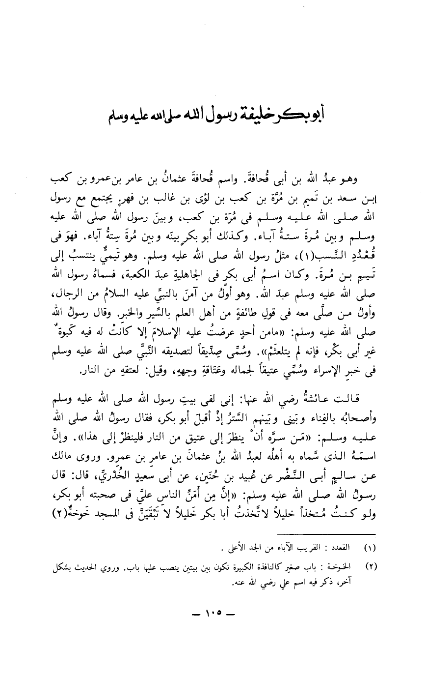 مسلم: حدثني عبد الله بن جعفر بن يحيى بن خالد، قال: نا معن، قال: نا مالك عن أبي النضر، عن عبيد بن حنين، عن أبي سعيد أنَّ رسول الله صلى الله عليه وسلم جلس على المنبر، فقال: " عبد خيَّره الله بين أن يؤتيه زهرة الدنيا، وبين ما عنده فاختار ما عنده ". فبكى أبو بكر وبكى، وقال: فديناك بآبائنا وأمَّهاتنا. قال: فكان رسول الله صلى الله عليه وسلم: هو المُخيَّر، وكان أبو بكر أعلمنا به، وقال رسول الله صلى الله عليه وسلم: " أنَّ من أمَّن الناس علي في ماله وصحبته أبو بكر، ولو كنت متخذا خليلا لاتخذت أبا بكر خليلا، ولكن أخوة الإسلام، لا تَبقَيَنَّ في المسجد خوخة
