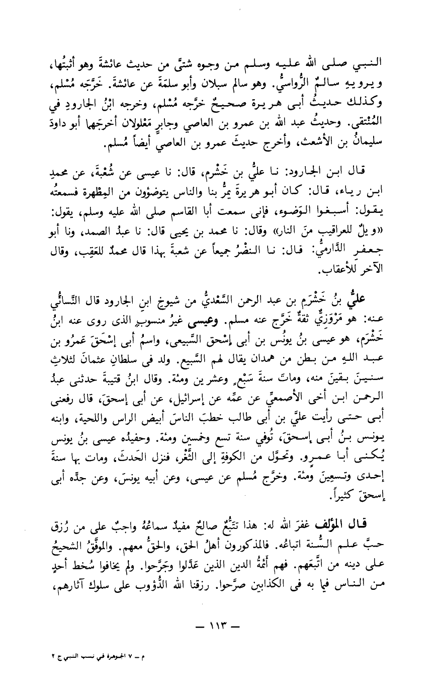 عليُّ بن خشرم بن عبد الرحمن السعديُّ من شيوخ ابن الجارود قال النَّسائي عنه: هو مروزيُّ ثقة خرّج عنه مسلم. وعيسى غير منسوب الذي روى عنه ابن خشرم، هو عيسى بن يونس بن إسحاق السَّبيعي، واسم أبى إسحاق عمرو بن عبد الله من بطن من همدان يقال لهم السَّبيع. ولد في سلطان عثمان لثلاث سنين بقين منه، ومات سنة سبع وعشرين ومئة. وقال ابن قتيبة حدثني عبد الرحمن ابن أخي الأصمعيِّ عن عمِّه عن إسرائيل، عن أبي إسحاق، قال رفعني أبي حتى رأيت عليَّ بن أبي طالب خطب الناس أبيض الرأس واللحية، وابنه يونس بن أبي إسحاق، توفي سنة تسع وخمسين ومئة. وحفيده عيسى بن يونس يكنى أبا عمرو. وتحوَّل من الكوفة إلى الثغر، فنزل الحدث، ومات بها سنة إحدى وتسعين ومئة. وخرَّج مسلم عن عيسى، وعن أبيه يونس، وعن جدِّه أبي إسحاق كثيرا.