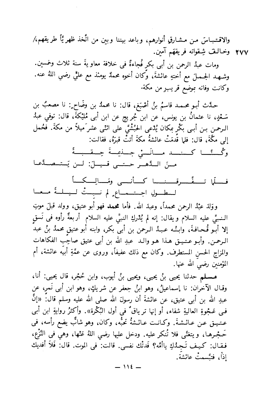 مسلم حدثنا يحيى بن يحيى، ويحيى بن أيوب، وابن حُجْر، قال يحيى: أنا، وقال الآخران: نا إسماعيلُ، وهو ابن جعفر عن شريك، وهو ابن أبي نمر، عن عبد الله بن أبي عتيق، عن عائشة أن رسول الله صلى الله عليه وسلم قال: " إنَّ في عجوة العالية شفاء، أو إنها ترياق في أول البُكرة ". وأكثر رواية ابن أبي العتيق عن عائشة. وكانت عائشة تحبُّه، وكان، وهو شاب يضع رأسه، في حجرها، ويتغنَّى فلا تنكر عليه. ودخل عليها رضي الله عنها، وهي في النَّزع، فقال: كيف تجدك يا أمَّه؟ فدكت نفسي. قالت: في الموت. قال: فلا أفديك إذا، فتبَّسمت عائشة.