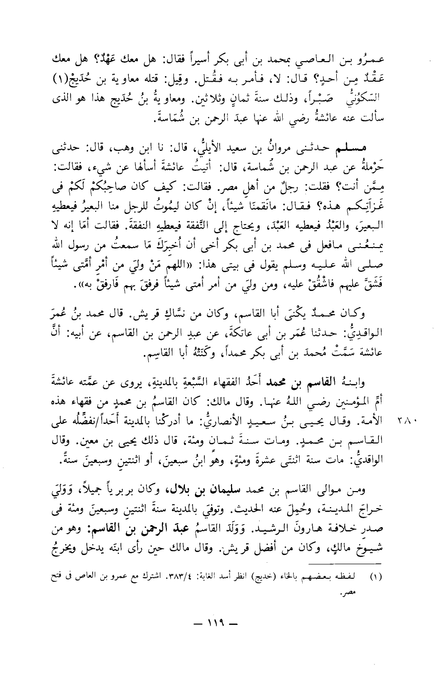 عمرو بن العاص بمحمد بن أبي بكر أسيرا فقال: هل معك عهد؟ هل معك عقد من أحد؟ قال: لا، فأمر به فقتل. وقيل: قتله معاوية بن حُدَيج السكونيُّ صبرا، وذلك سنة ثمان وثلاثين. ومعاوية بن خديج هذا هو الذي سألت عنه عائشة رضي الله عنها عبد الرحمن بن شُمّاسة.