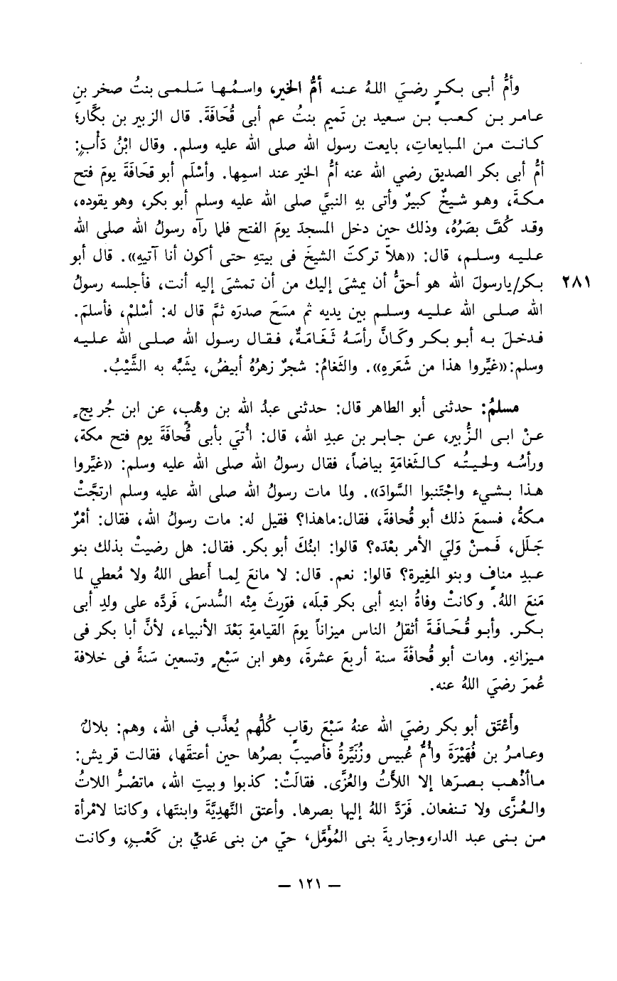 مسلمُ: حدثني أبو الطاهر قال: حدثني عبدُ الله بن وهْب، عن ابن جُريحٍ عن أبيْ الزُّبير، عن جابر بن عبدِ الله، قال: أُتيَ بأبي قُحافَةَ يوم فتح مكة، ورأسُه ولحيتُه كالثَغامَةِ بياضا، فقال رسول الله صلى الله عليه وسلم: " غيِّروا هذا بشيء واجْتَنبوا السَّوادَ ". ولما مات رسول الله صلى الله عليه وسلم ارتجَّتْ مكةُ، فسمعَ ذلك أبو قُحافةَ، فقال: ما هذا؟ فقيل له: مات رسول الله، فقال: أمْرٌ جَلَل، فَمنْ وَليَ الأمر بعْدَه؟ قالوا: ابنُكَ أبو بكر. فقال: هل رضيتْ بذلك بنو عبدِ مناف وبنو المغِيِرة؟ قالوا: نعم. قال: لا مانعَ لِما أَعطى اللهُ ولا مُعطي لما مَنعَ اللهُ. وكانتْ وفاةُ ابنهِ أبي بكر قبلَه، فوَرِثَ مِنْه السُّدسَ، فَردَّه على ولدِ أبي بكر. وأبو قُحَافَةَ أثقلُ الناس ميزاناً يومَ القيامةِ بَعْدَ الأنبياء، لأنَّ أبا بكر في ميزانهِ. ومات أبو قُحافَةَ سنة أربعَ عشرةَ، وهو ابن سَبْعٍ وتسعين سَنةً في خلافة عُمرَ رضيَ الله عنه.