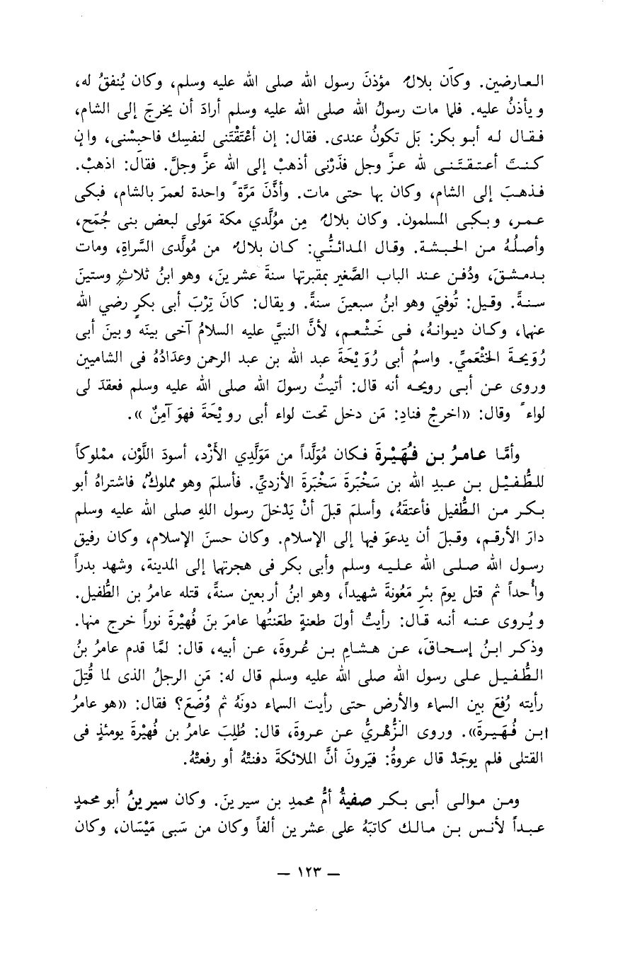 وأمَّا عامر بن فُهيرَة فكان مُوَلَّدا من مُوَلَّدي الأزد، أسود اللون، مملوكا للطُّفيل بن عبد الله بن سَخْبَرَة الأزدي. فأسلم وهو مملوك، فاشتراه أبو بكر من الطُّفَيل فأعتقه، وأسلم قبل أن يدخل رسول الله صلى الله عليه وسلم دار الأرقم، وقبل أن يدعو فيها إلى الإسلام. وكان حسِن الإسلام، وكان رفيق رسول الله صلى الله عليه وسلم وأبي بكر في هجرتهما إلى المدينة. وشهد بدرا وأُحُد ثم قُتل في يوم بئر مَعُونَة شهيدا، وهو ابن أربعين سنة، قتله عامر بن الطُّفيل. ويروى عنه أنه قال: رأيت أول طعنة طعنتها عامر بن فُهيرة نورا خرج منها. وذكر ابن إسحاق، عن هشام بن عروة، عن أبيه، قال: لما قدم عامر بن الطُّفَيل على رسول الله صلى الله عليه وسلم قال له: مَن الرجل الذي لما قُتل رأيته رُفع بين السماء والأرض حتى رأيت السماء دونه ثم وضع؟ فقال: " هو عامر ابن فُهيرة ". وروى الزُّهريّ عن عروة، قال: طُلب عامر بن فُهيرة يومئذ في القتلى فلم يوجد قال عروة: فيروون أن الملائكة دفنته أو رفعته.