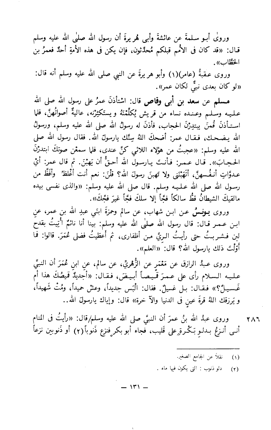 وروى عقبة) عامر (وأبو هريرة عن النبي صلى الله عليه وسلم أنه قال: " لو كان بعدي نبيي لكان عمر ".