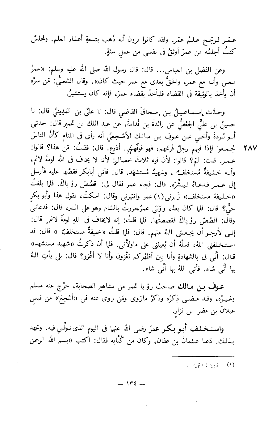 وحدَّث إسماعيل بن إسحاق القاضي قال: نا علي بن الدينَّي قال: نا حسين بن عليٍّ عن زائدة بن قدامة، عن عبد الملك بن عمير قال: حدثني أبو بردة وأخي عن عوف بن مالك الأشجعيِّ أنه رأى في المنام كأنَّ الناس جمعوا فإذا فيهم رجل فرعهم، فهو فوقهم.. أذرع. قال: فقلت: من هذا؟ قالوا: عمر. قلت: لم؟ قالوا: لأن فيهم ثلاث خصالٍ: لأنه لا يخاف في الله لومة لائم، وأنه خليفة مستخلف، وشهيد مستشهد. قال: فأتى أبا بكر فقصَّها عليه فأرسل إلى عمر فدعاه ليبشِّره. قال: فجاء عمر فقال لي: اقصص رؤياك. فلما بلغت " خليفة مستخلف " زبرني عمر وانتهرني وقال: اسكت، تقول هذا وأبو بكرٍ حيِّ؟ قال: فلما كان بعد، وولي عمر، مررت بالشام وهو على المنبر، قال: فدعاني وقال: اقصص رؤياك فقصتها. فلما قلت: إنه لا يخاف في الله لومة لائمٍ قال: إني لأرجو أن يجعلوا الله منهم. قال: فلما قلت " خليفةُ مستخلفُ " قال: قد استخلفني الله، فسلهُ أن يُعينني على ما ولاني. فلما أن ذكرت " شهيد مستشهد " قال: أني لي بالشهادة وأنا بين أظهركم تغزون وأنا لا أغزو؟ قال: بلى يأت الله بها إن شاء. فأتى الله بها أنى شاء.