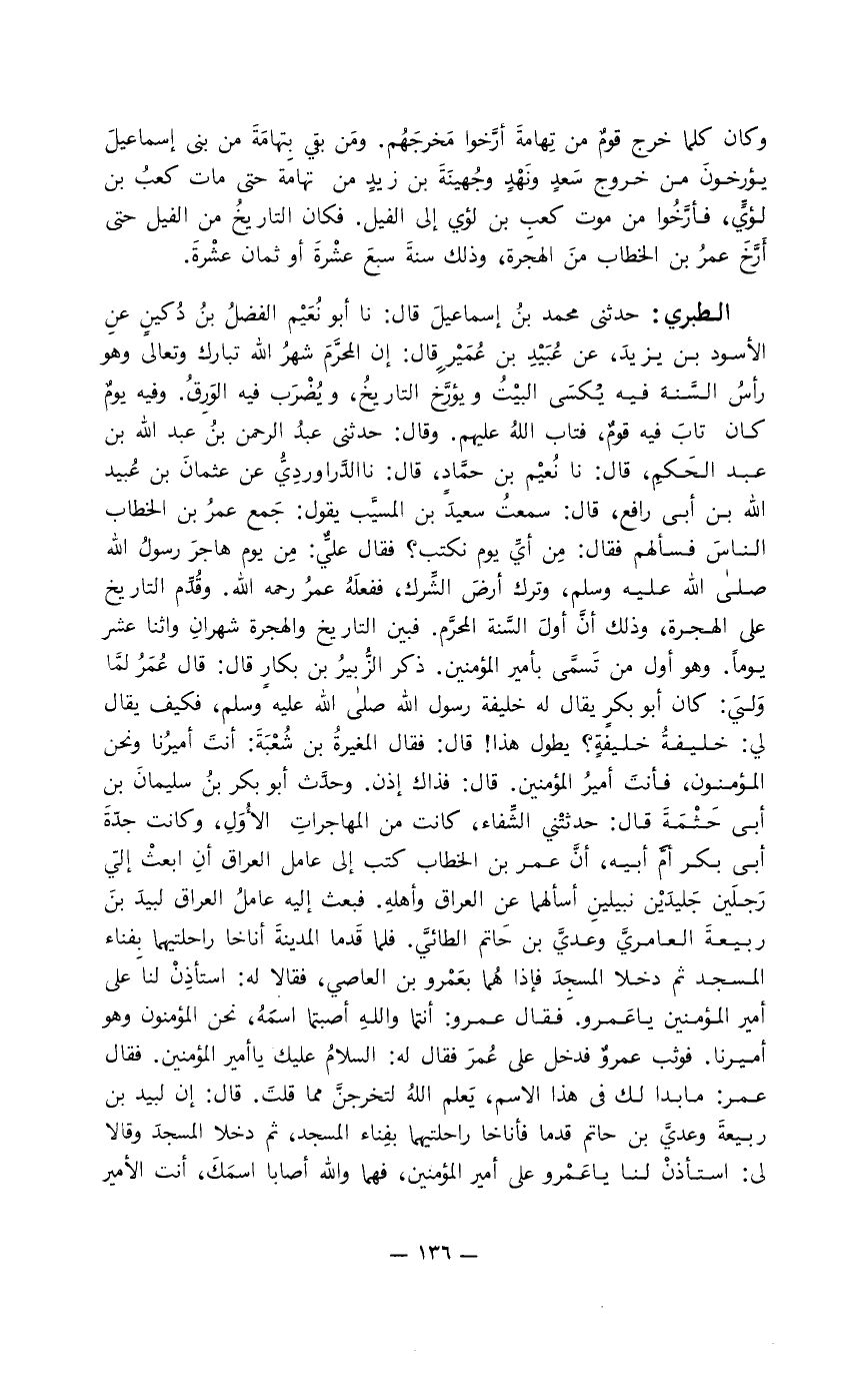 الطبري: حدثني محمد بن إسماعيل قال: لا أبو نعيم الفضل بن دكين عن الأسود بن يزيد، عن عبيد بن عمير قال: إن المحرم شهر الله تبارك وتعالى وهو رأس فيه يكسى البيت ويؤرَّخ التاريخ، ويضرب فيه الورق. وفيه يوم كان تاب فيه قوم، فتاب الله عليهم. وقال: حدثني عبد الرحمن بن عبد الله بن عبد الحكم، قال: نا نعيم بن حمَّاد، قال: نا الدَّراورديُّ عن عثمان بن عبيد الله بن أبي رافع، قال: سمعت سعيد بن المسَّيب يقول: جمع الناس فسألهم فقال: من أي يوم نكتب؟ فقال عليَّ: من يوم هاجر رسول الله صلى الله عليه وسلم، وترك أرض الشِّرك، ففعله عمر رحمه الله. وقدم التاريخ على الهجرة، وذلك أن أول السنة المحرَّم. فبين التاريخ وهجرة شهران واثنا عشر يوماً. وهو أول من تسمَّى بأمير المؤمنين. وذكر الزبير بن بكار قال: قال عمر لما ولي: كان أبو بكر يقال له خليفة رسول الله صلى الله عليه وسلم فكيف يقال لي: خليفة خليفة؟ يطول هذا! قال: فقال المغيرة بن شعبه: أنت أميرنا ونحن المؤمنون، فأنت أمير المؤمنين. قال: فذاك إذن. وحدث أبو بكر بن سليمان بن أبي حيثمة قال: حدثتني الشفاء، كانت من المهاجرات الأول وكانت جده أبي بكر أم أبيه، أن عمر بن الخطاب كتب إلى عامل العراق أن ابعث إلي رجلين جليدين نبيلين أسألهما عن العراق وأهله. فبعث أليه عامل العراق لبيد بن ربيعة العامري وعديَّ بن حاتم الطائيَّ. فلما قدما المدينة أناخا راحلتيهما بفناء المسجد ثم دخلا المسجد فإذا هما بعمرو بن العاصي، فقالا له: أستأذن لنا على أمير المؤمنين يا عمرو. فقال عمرو: أنتما والله أصبتما اسمه، نحن المؤمنون وهو أميرنا. فوثب عمرو فدخل على عمر فقال له: السلام عليك يا أمير المؤمنين. فقال عمر: ما بدا لك في هذا الاسم، يعلم الله لتخرجن مما قلت. قال: إن بيد بن ربيعةَّ وعديَّ بن حاتم قدما فأناخا راحلتيهما بفناء المسجد، ثم دخلا المسجد وقالا لي: أستأذن لنا يا عمر على أمير المؤمنين، فهما والله أصابا اسمك، أنت الأمير