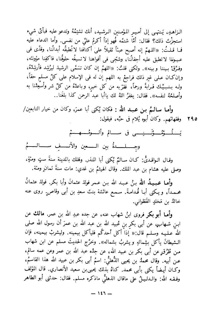 وأما أبو بكر فروى ابن شهاب عنه، عن جده عبد الله بن عمر. مالك عن ابن شهابٍ، عن أبو بكر بن عبيد الله بن عبد الله بن عمر أن رسول الله صلى الله عليه وسلم قال: " إذا أكل أحدكم فليأكل بيمينه. وليشرب بيمينه، فإن الشيطان يأكل بشماله ويشرب بشماله ". وخَّرج الحديث مسلم عن ابن شهاب من طرقٍ عن أبي بكر بن عبيد الله، عن جدِّه عبد الله بن عمر وعن عمه سالم، عن أبيه. وقال محمد بن يحيى الذُّهليُّ: اسم أبي بكر بن عبيد الله هذا القاسم، وكان أيضاً يكنى بأبي محمد. كناه بذلك يحيى بن سعيد الأنصاري. قال المؤلف وفقه الله: والدليل على ما قال الذهليُّ ما ذكره مسلم. فقال حدثني أبو الطاهر