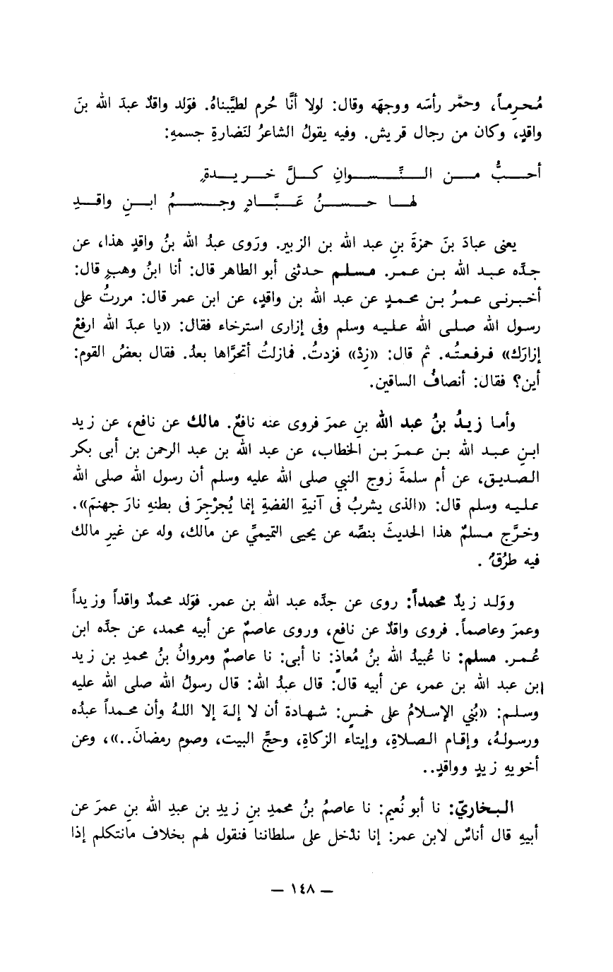 يعني عباد بن حمزة بن عبد الله بن الزبير. وروى عبد الله بن واقد هذا، عن جدِّه عبد الله بن عمر. مسلم حدثني أبو طاهر قال: أنا أبن وهب قال: أخبرني عمر بن محمد عن عبد الله بن واقد، عن ابن عمر قال: مررت على رسول الله صلى الله عليه وسلم وفي إزاري استرخاء فقال: " يا عبد الله ارفع إزارك " فرفعته. ثم قال: " زد " فزدت. فمازلت أتحرَّاها بعد. فقال بعض القوم: أين؟ فقال: أنصاف الساقين.