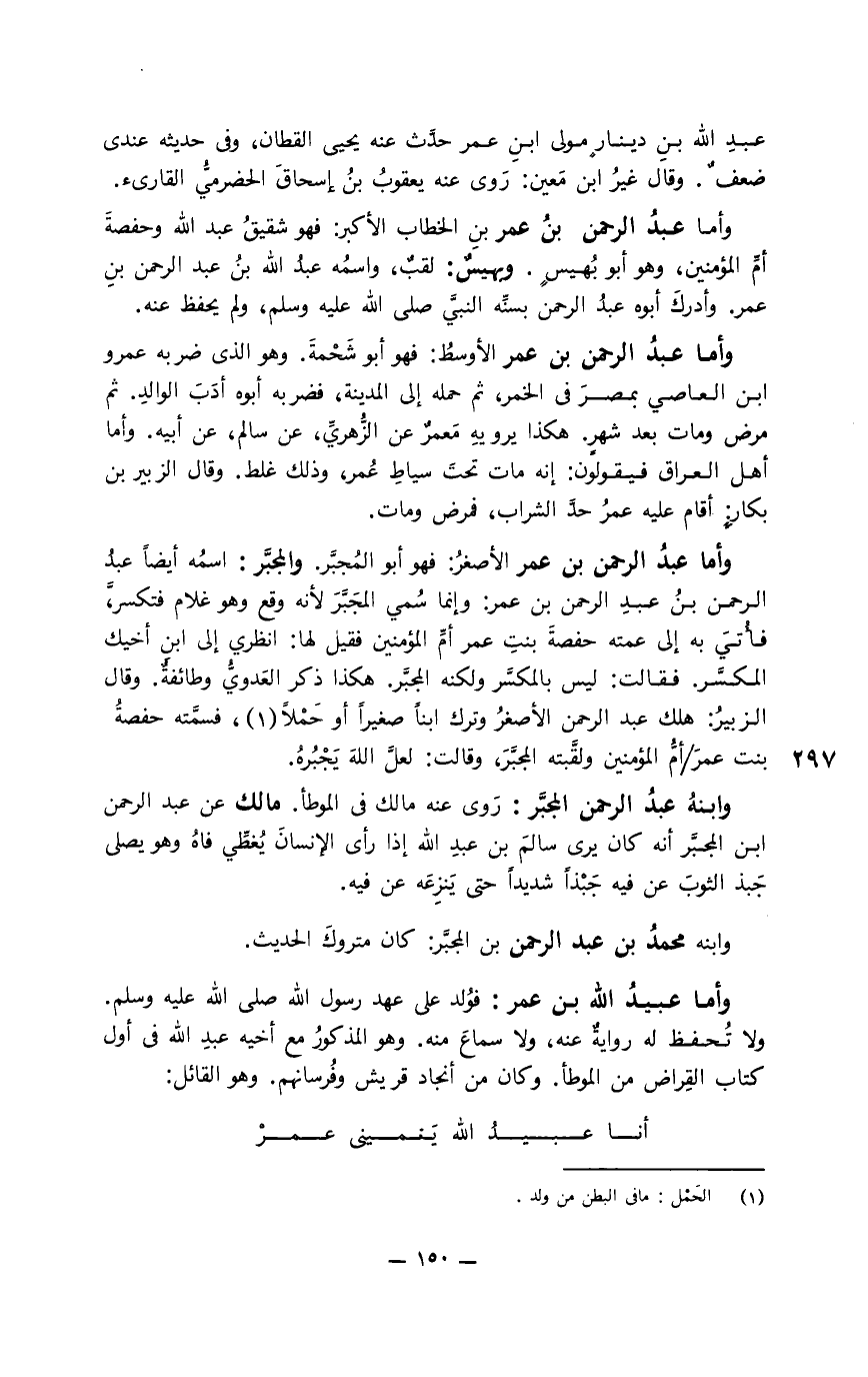 وأما عبد الله بن عمر الأصغر: فهو أبن المجبَّر: اسمه أيضا عبد الرحمن بن عبد الرحمان بن عمر: وإنما سمي المتجبر لأنه وقع وهو غلام فتكسر، فأتي به إلى عمته حفصة بنت عمر أمِّ المؤمنين فقيل لها: انظري إلى ابن أخيك المكسَّر. فقالت: ليس بالمكسر ولكنه المجبَّر. هكذا ذكر العدويُّ وطائفة. وقال الزبير: هلك عبد الرحمن الأصغر وترك ابناً صغيراً أو حملاً، فسمَّته حفصة بن عمر أمُّ المؤمنين ولقَّبته المجبَّر، وقالت: لعلَّ الله يجبره.
