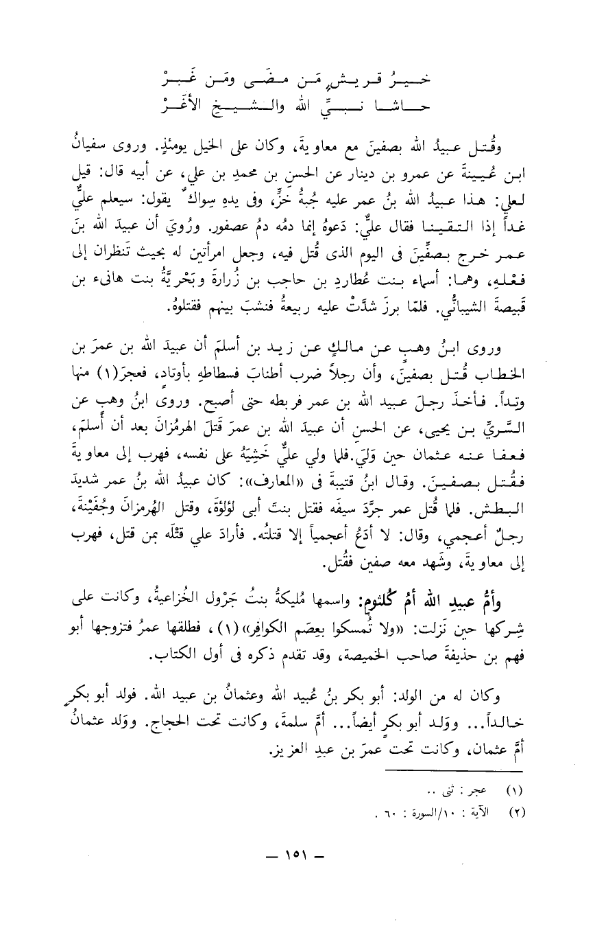 وأمُّ عبيد الله أم كلثوم: واسمها مليكة بنت جرول الخزاعية، وكانت على شركها حين نزلت:) ولا تمسكوا بعصم الكوافر (، فطلقها عمر فتزوجها أبو فهم بن حذيفة صاحب الخميصة، وقد تقدم ذكره في أول الكتاب.