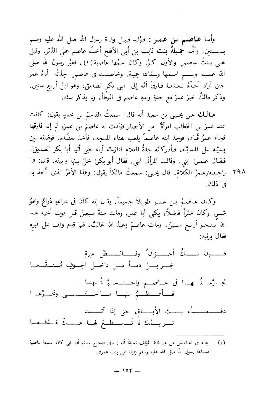 وأما عاصم بن عمر: فولد قبل وفاة رسول الله صلى الله عليه وسلم بسنتين. وأمُّه جميلة بنت ثابت بن أبي الأفلح أخت عاصم حمي الدبر، وقيل هي بنت عاصم والأول أكثر. وكان اسمها عاصية، فغير رسول الله صلى الله عليه وسلم اسمها وسماها جميلة. وخاصمت في عاصمٍ جدته أباه عمر حين أراد أخذه بعدما فارق أمه إلى أبي بكر الصديق، وه ابن أربع سنين. وذكر مالك خبر عمر مع جدة ولده عاصم في الموطأ، ولم يذكر سنَّه.