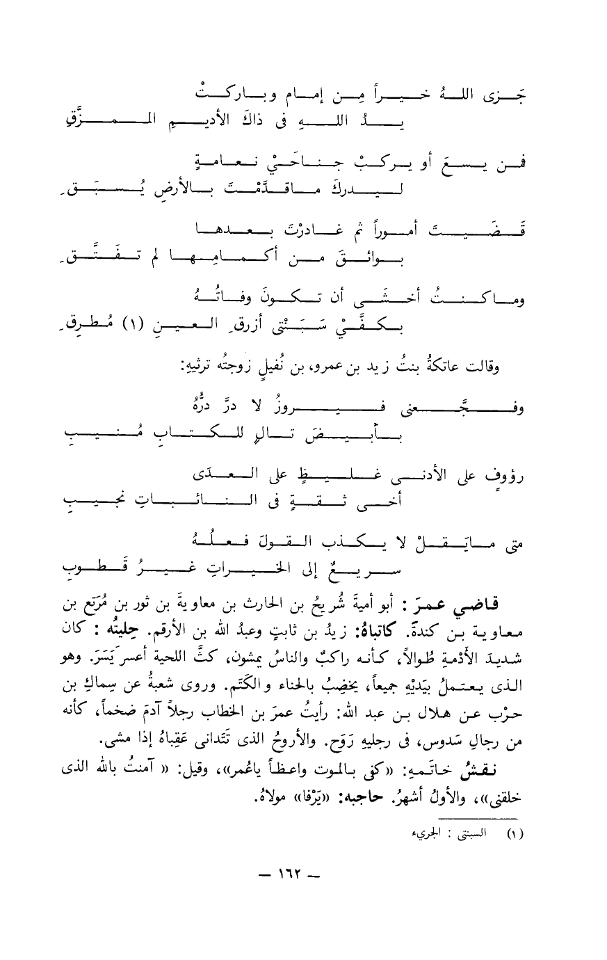 قاضي عمر: أبو أميَّة شُرَيح بن الحارث بن معاوية بن ثور بن مُرتع بن معاوية بن كندة. كاتباه: زيد بن ثابت وعبد الله بن الأرقم. حِليته: كان شديد الأدمة طُوالا، كأنه راكب والناس يمشون، كثَّ اللحية أعسر يَسَرَ. وهو الذي يعتمل بيده جميعا، يخضب بالحناء والكَتَم. وروى شعبة عن سِمَاك بن حرب عن هلال بن عبد الله: رأيت عمر بن الخطاب رجلا آدم ضخما، كأنه من رجال سدوس، في رِجليه رَوَح. والأروح الذي تتدانى عَقِباه إذا مشى.