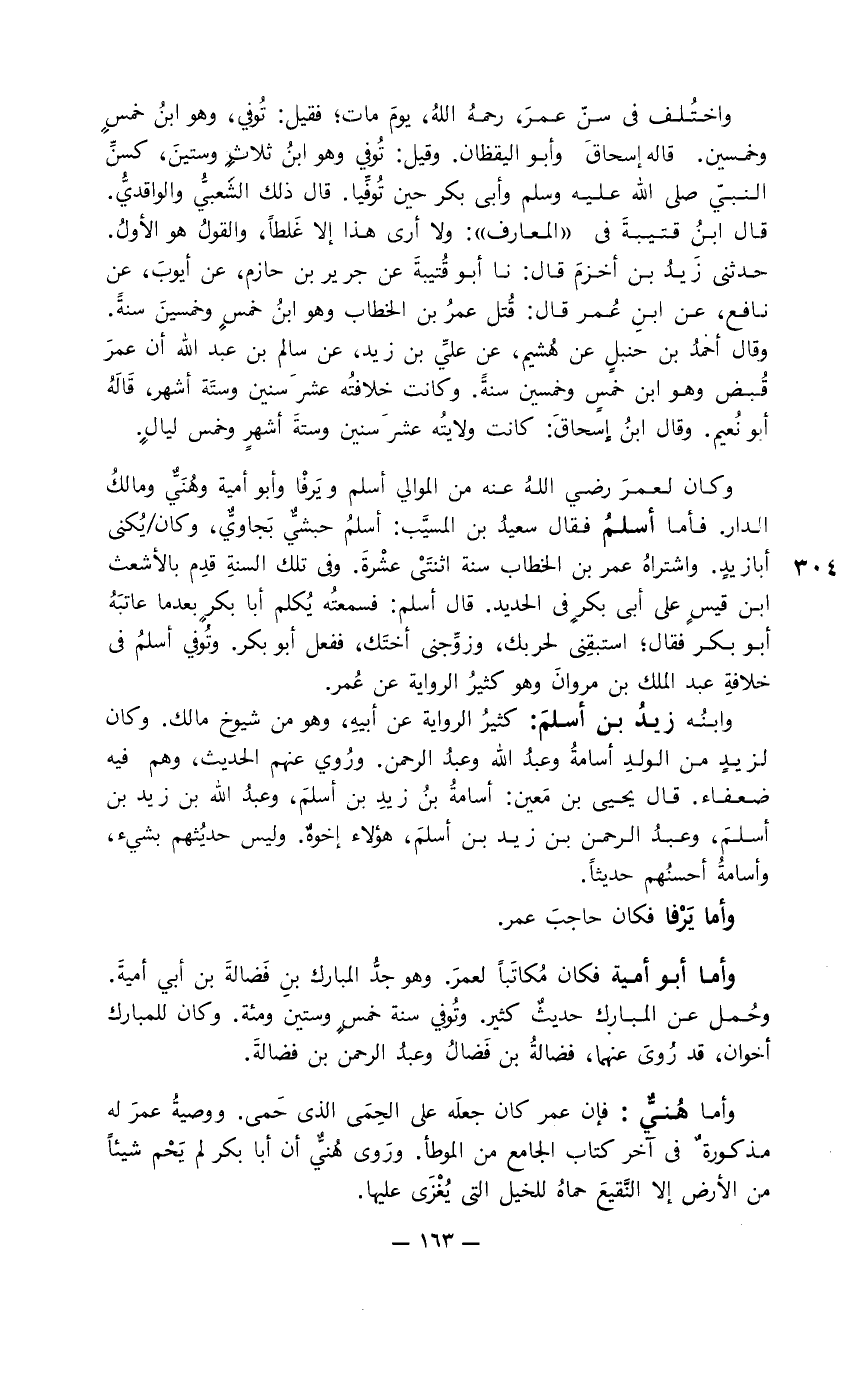 وكان لعمر رضي الله عنه من الموالي أسلم ويرفا وأبو أمية وهُنَيَّ ومالك الدار. فأما أسلم فقال سعيد بن المسيَّب: أسلم حبشيٌّ بجاويٌّ، وكان يُكنى أبا زيد. واشتراه عمر بن الخطاب سنة اثنتي عشرة. وفي تلك السنة قدِم بالأشعث ابن قيس على أبي بكر في الحديد. قال أسلم: فسمعته يكلم أبا بكر بعدما عاتبه أبو بكر فقال؛ استبقيني لحربك، وزوِّجني أختك، ففعل أبو بكر. وتُوفي أسلم في خلافة عبد الملك بن مروان وهو كثير الرواية عن عمر.