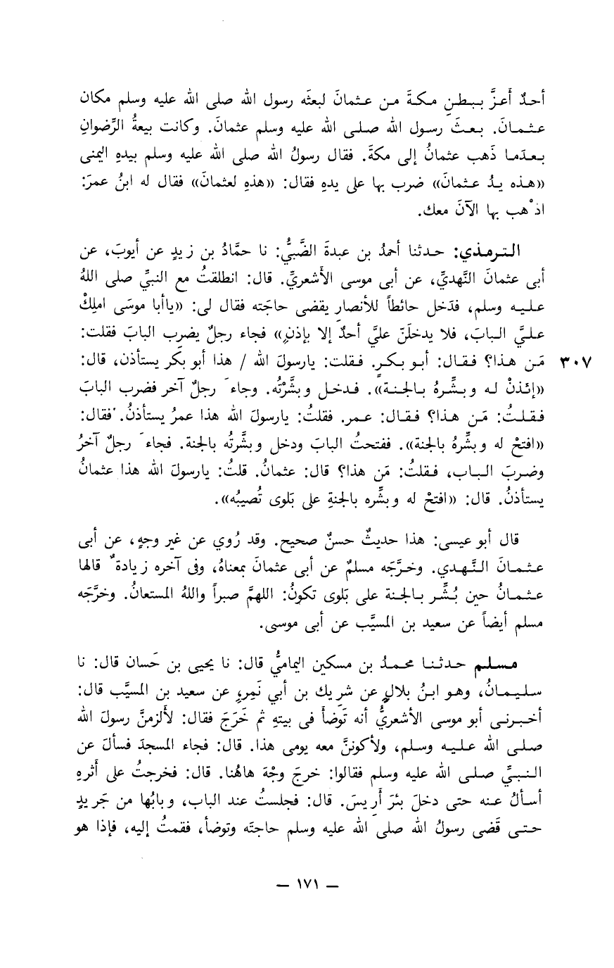 الترمذيّ: حدثنا أحمد بن عبدة الضَّبيُّ: نا حمَّاد بن زيد عن أيُّوب، عن أبي عثمان النَّهديَّ، عن أبي موسى الأشعريِّ. قال: انطلقت مع رسول الله صلى الله عليه وسلم، فدخل حائطا للأنصار يقضي حاجته فقال لي: " يا أبا موسى أملِكَ عليَّ الباب، فلا يدخلن عليَّ أحد إلا بإذن " فجاء رجل يضرب الباب فقلت: من هذا؟ فقال: أبو بكر. فقلت: يا رسول الله هذا أبو بكر يستأذن، قال: " إئذن له وبشِّره بالجنَّة ". فدخل وبشَّرته. وجاء رجل آخر فضرب الباب فقلت: من هذا؟ فقال: عمر. فقلت: يا رسول الله هذا عمر يستأذن. فقال: " افتح له وبشِّره بالجنة ". ففتحت الباب ودخل وبشَّرته بالجنَّة. فجاء رجل آخر وضرب الباب، فقلت: من هذا؟ قال: عثمان. قلت: يا رسول الله هذا عثمان يستأذن. قال: " افتح له وبشِّره بالجنة على بلوى تصيبه ".