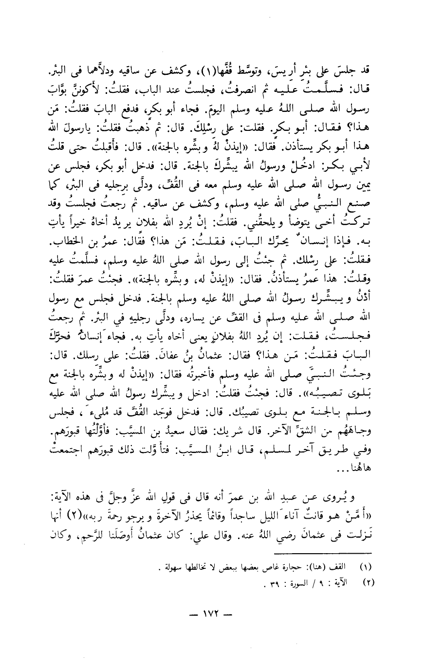 قد جلس على بئر أريس، وتوسَّط قُفَّها، وكشف عن ساقيه ودلاَّهما في البئر. قال: فسلَّمت عليه ثم انصرفت، فجلستُ عند الباب، فقلت: لأكوننَّ بواب رسول الله صلى الله عليه وسلم اليوم. فجاء أبو بكر، فدفع الباب: فقلت: من هذا؟ فقال: أبو بكر. فقلت: على رسلك. قال: ثم ذهبت فقلت: يا رسول الله هذا أبو بكر يستأذن. فقال: " إيذن له، وبشِّره بالجنَّة ". قال: فأقبلت حتى قلت لأبي بكر. أدخل ورسول الله يبشِّرك بالجنَّة. قال: فدخل أبو بكر، فجلس عن يمين رسول الله صلى الله عليه وسلم معه في القفِّ ودلَّى برجليه في البئر، كما صنع النبيَّ صلى الله عليه وسلم، وكشف عن ساقيه. ثم رجعت فجلست وتركت أخي يتوضأ ويلحقني. فقلت: إن يُرد الله بفلان يريد أخاه خيرا يأت به. فإذا إنسان يحرِّك الباب، فقلت: من هذا؟ فقال: عمر بن الخطاب. فقلت: على رسلك. ثم جئت إلى رسول الله صلى الله عليه وسلم، فسلَّمتُ عليه وقلت: هذا عمر يستأذن. فقال: " إيذن له، وبشِّره بالجنَّة ". فجئت عمر فقلت: أذِن ويبشِّرك رسول الله صلى الله عليه وسلم بالجنَّة. فدخل فجلس مع رسول الله صلى الله عليه وسلم في القفِّ عن يساره، ودلَّى رجليه في البئر. ثم رجعت فجلست فقلت: إن يُرد الله بفلان يعني أخاه يأت به. فجاء إنسان فحرَّك الباب فقلت: من هذا؟ فقال: عثمان بن عفان. فقلت: على رسلك. قال: وجئت النبيّ صلى الله عليه وسلم فأخبرته فقال: " إيذن له، وبشِّره بالجنَّة مع بلوى تصيبه ". قال: فجئت فقلت: ادخل وبشَّرك رسول الله صلى الله عليه وسلم بالجنَّة مع بلوى تصيبك. قال: فوجد القفَّ قد مُلئ، فجلس وجاههم من الشقِّ الآخر. قال شريك: فقال سعيد بن المسيَّب: فأوَّلتها قبورهم. وفي طريق آخر لمسلم، قال ابن المسيَّب: فتأوَّلت ذلك قبورهم اجتمعت هاهنا ...