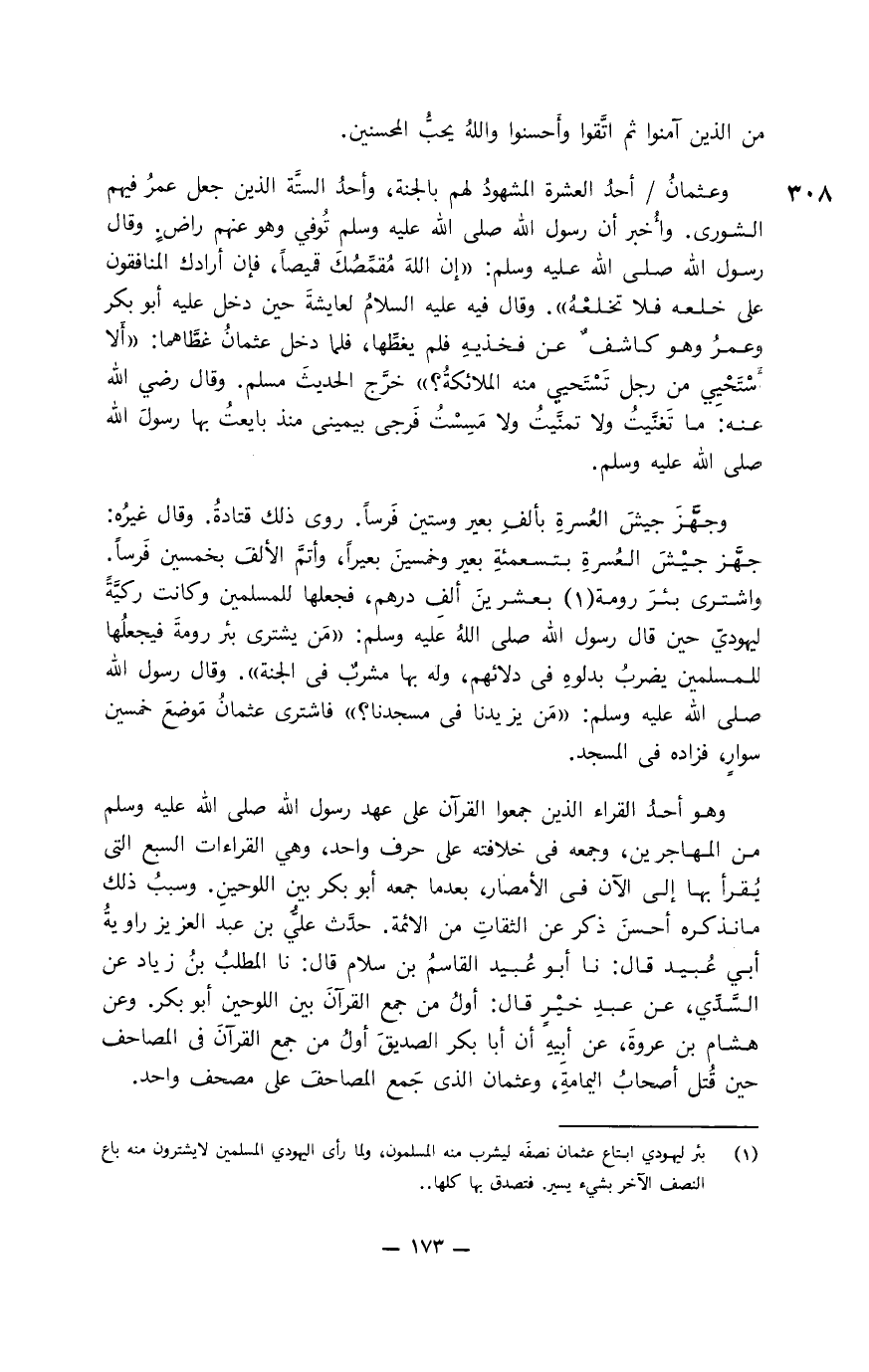 وجهَّز جيش العسرة بألف بعير وستين فرسا. روى ذلك قتادة. وقال غيره: جهَّز جيش العسرة بتسعمئة بعير وخمسين بعيرا، وأتمَّ الألف بخمسين فرسا. واشترى بئر رومة بعشرين ألف درهم، فجعلها للمسلمين وكانت ركيَّة ليهودي حين قال رسول الله صلى الله عليه وسلم: " من يشتري بئر رومة فيجعلها للمسلمين يضرب بدلوه في دلائهم، وله بها مشرب في الجنة ". وقال رسول الله صلى الله عليه وسلم: " من يزيدنا في مسجدنا؟ " فاشترى عثمان موضع خمسين سوار فزاده في المسجد.