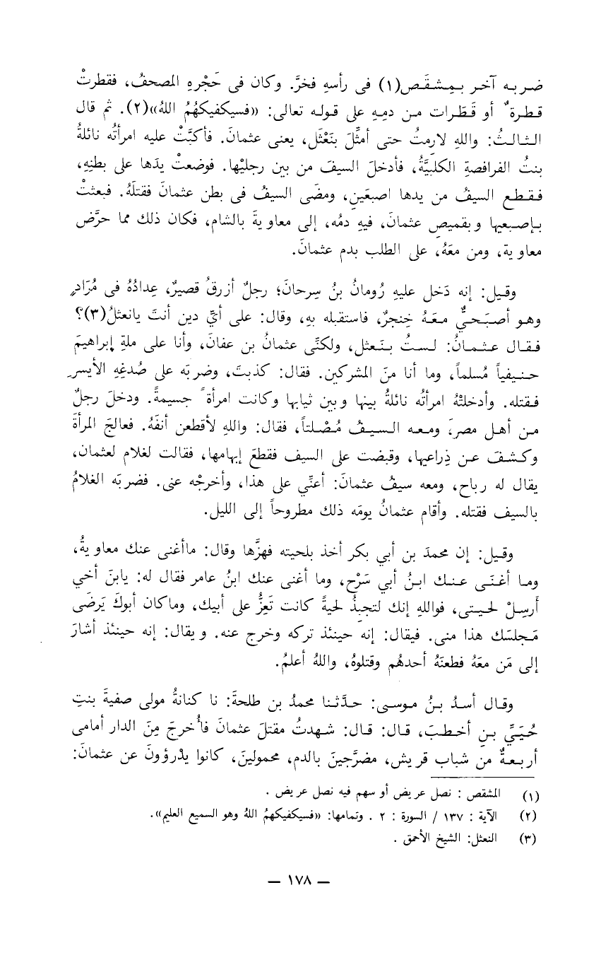 ضربه آخر بمشقص في رأسه فخرَّ. وكان في حجره المصحف فقطرت قطرة أو قطرات من دمه على قوله تعالى:) فسيكفيكهُمُ الله (. ثم قال الثالث: والله لا رمتُ حتى أمثِّل بنعثل، يعني عثمان. فأكبَّت عليه امرأته نائلة بنت الفرافصة الكلبيَّة. فأدخل السيف من بين رجليها فوضعت يدها على بطنه فقطع السيف من يدها إصبعين، ومضى السيف في بطن عثمان فقتله فبعثت بإصبعيها وبقميص عثمان، فيه دمه، إلى معاوية في الشام، فكان ذلك مما حرَّض معاوية ومن معه، على الطلب بدم عثمان.