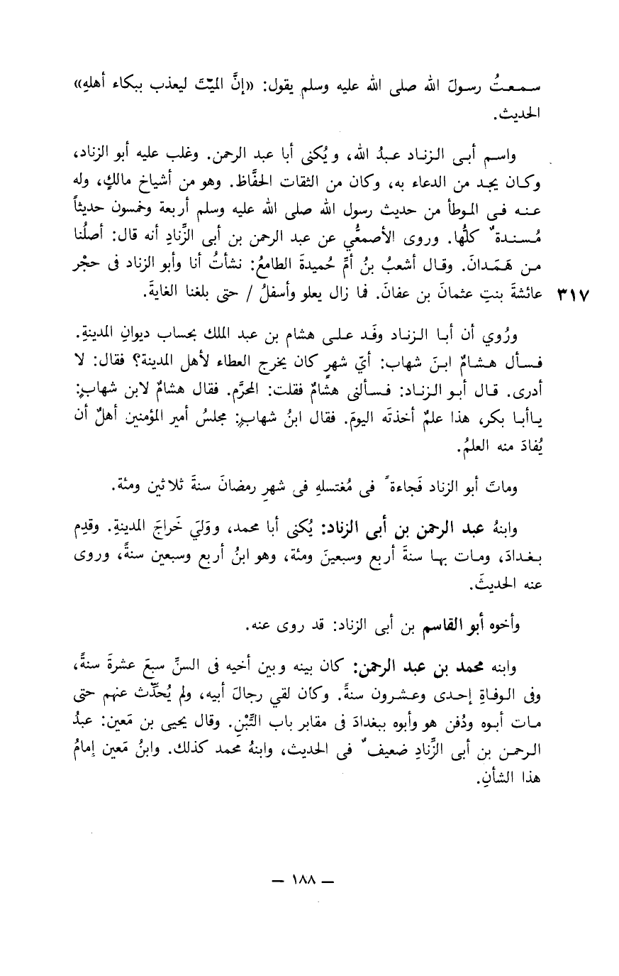 واسم أبي الزناد عبد الله، ويكنى أبا عبد الرحمن. وغلب عليه أبو الزناد، وكان يجد من الدعاء به، وكان من الثُقات الحفَّاظ. وهو من أشياخ مالك، وله عنه في الموطأ من حديث رسول الله صلى الله عليه وسلم أربعة وخمسون حديثا مسندة كلُّها. وروى الأصمعيُّ عن عبد الرحمن بن أبي الزِّناد أنه قال: أصلنا من همدان. وقال أشعب بن أمِّ حُميدة الطامع: ونشأت أنا وأبو الزناد في حجر عائشة بنت عثمان بن عفان. فما زال يعلو وأسفل حتى بلغنا الغاية.