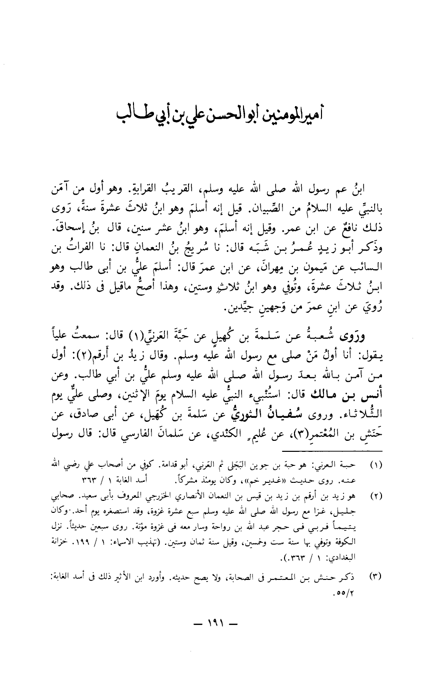 ابن عم رسول الله صلى الله عليه وسلم القريب القرابة. وهو أول من آمن بالنبيِّ عليه السلام من الصِّبيان. قيل إنه أسلم وهو ابن ثلاث عشرة سنة، روى ذلك نافع عن ابن عمر. وقيل إنه أسلم وهو ابن عشر سنين، قال ابن إسحاق. وذكر أبو زيد عمر بن شبه قال: نا سُريج بن النعمان قال: نا الفرات بن السائب عن ميمون بن مهران، عن ابن عمر قال: أسلم عليُّ بن أبي طالب وهو ابن ثلاث عشرة سنة، وتوفي وهو ابن ثلاث وستين، وهذا أصحُّ ما قيل في ذلك. وقد روي عن ابن عمر من وجهين جيِّدين.