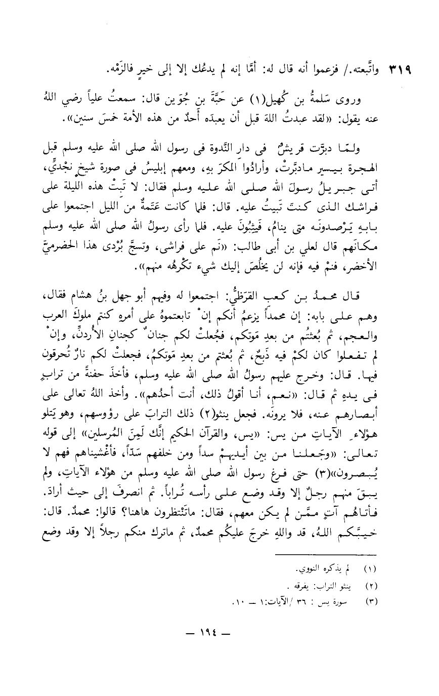 قال محمدُ بن كعب القرظيُّ: اجتمعوا له وفيهم أبو جهل بن هشام فقال، وهم على بابه: إن محمد يزعم أنكم إن تابعتموه على أمره كنتم ملوك العرب والعجم، ثم بُعثتم من بعد موتكم، فجُعلت لكم جنان كجنان الأُردنِّ، وإن لم تفعلوا كان لكم فيه ذبح، ثم بُعثتم من بعد موتكم، فجعلت لكم نار تُحرقون فيها. قال: وخرج عليهم رسول الله صلى الله عليه وسلم، فأخذ حفنة من تراب في يده ثم قال: " نعم، أنا أقول ذلك، أنت أحدهم ". وأخذ الله تعالى على أبصارهم عنه، فلا يرونه. فجعل ينثو ذلك التراب على رؤوسهم، وهو يتلو هؤلاء الآيات من يس:) يس والقرآن الحكيم إنَّك لَمِنَ المُرسلين (إلى قوله تعالى:) وجَعانا من بين أيديهمْ سداً ومن خلفهم سَدَاً فأغْشيناهم فهم لا يُبصرون (حتى فرغ رسول الله صلى الله عليه وسلم من هؤلاء الآيات، ولم يبق منهم رجل إلا وقد وضع على رأسه ترابا. ثم انصرف إلى حيث أراد. فأتاهم آت ممَّن لم يكن معهم، فقال: ما تنتظرون هاهنا؟ قالوا: محمد. قال: خيَّبكم الله، قد والله خرج عليكم محمد، ثم ما ترك منهم رجلا إلا وقد وضع