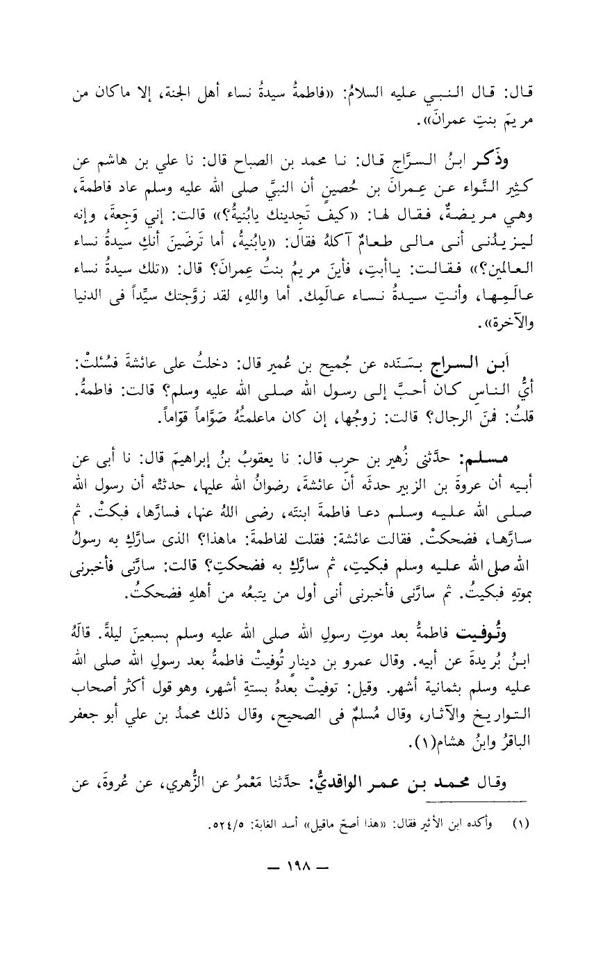 مسلم: حدَّثني زُهير بن حرب قال: نا يعقوب بن إبراهيم قال: نا أبي عن أبيه أن عروة بن الزبير حدثه أن عائشة، رضوان الله عليها، حدثته أن رسول الله صلى الله عليه وسلم دعا فاطمة ابنته، رضي الله عنها، فسارَّها، فبكت. ثم سارَّها، فضحكت. فقالت عائشة: فقلت لفاطمة: ما هذا؟ الذي سارَّك به رسول الله صلى الله عليه وسلم فبكيت، ثم سارَّك به فضحكت؟ قالت: سارَّني فأخبرني بموته فبكيت. ثم سارَّني فأخبرني أني أول من يتبعه من أهله فضحكت.