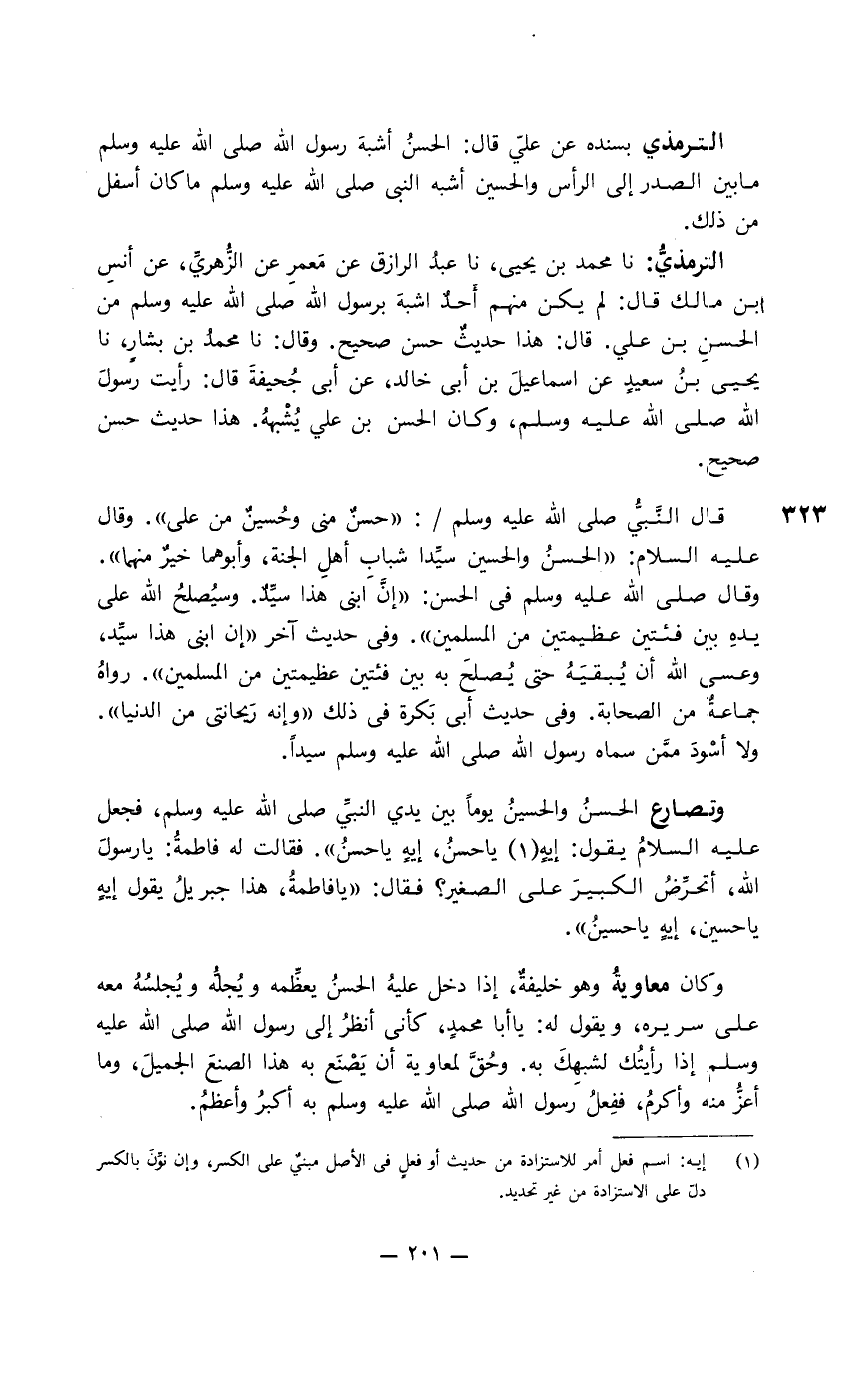 الترمذي: بسنده عن عليّ قال: الحسن أشبه رسول الله صلى الله عليه وسلم ما بين الصدر إلى الرأس والحسين أشبه النبيّ صلى الله عليه وسلم ما كان أسفل من ذلك.