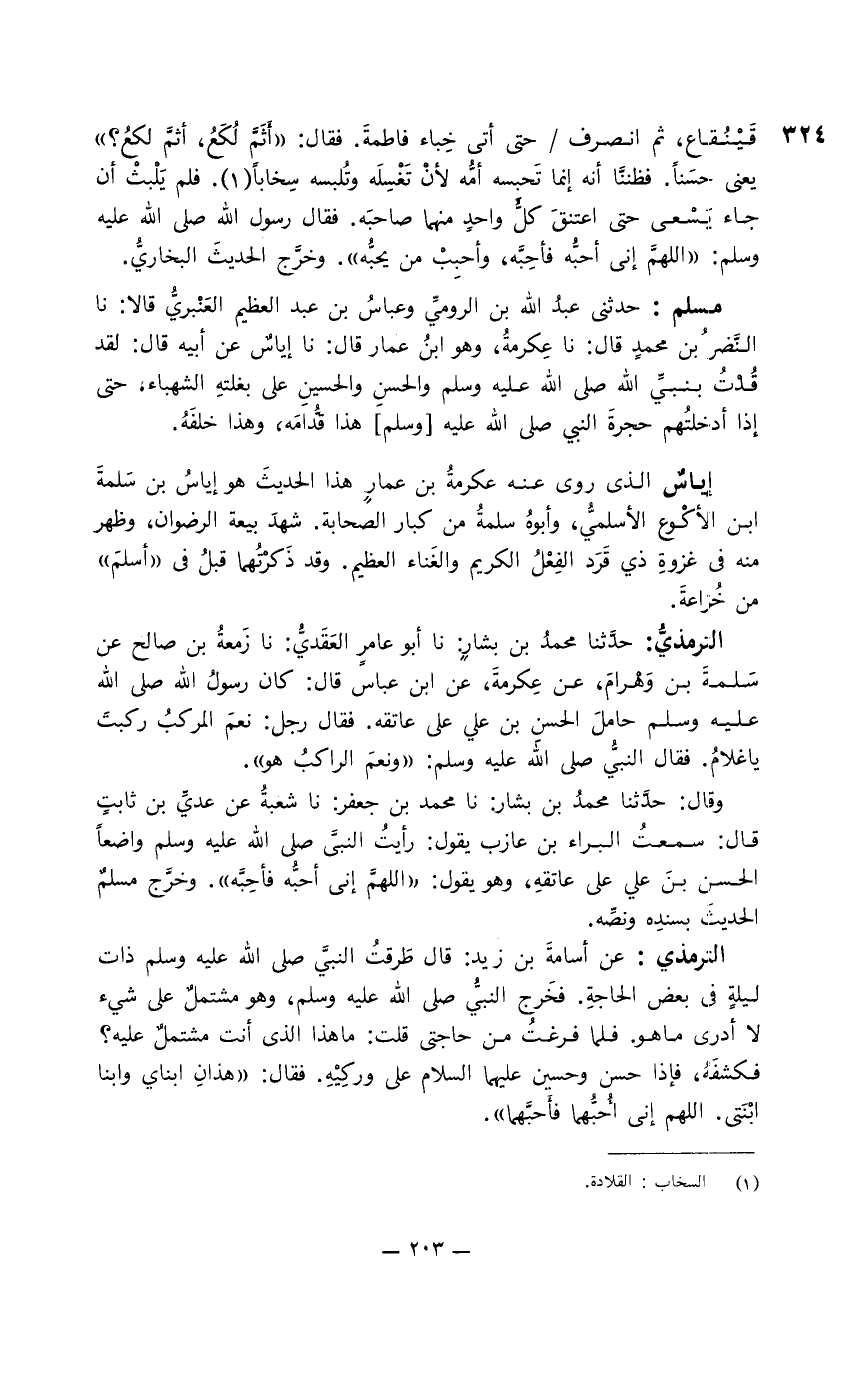 الترمذيُّ: عن أسامة بن زيد قال: طَرقت النبيَّ صلى الله عليه وسلم ذات ليلة في بعض الحاجة. فخرج النبيُّ صلى الله عليه وسلم، وهو مشتمل على شيء لا أدري ما هو. فلما فرغت من حاجتي قلت: ما هذا الذي أنت مشتمل عليه؟ فكشفه، فإذا حسن وحسين عليهما السلام على وركيه. فقال: " هذان ابناي وابنا ابنتي إني أُحبُّهما فأَحبَّهما ".