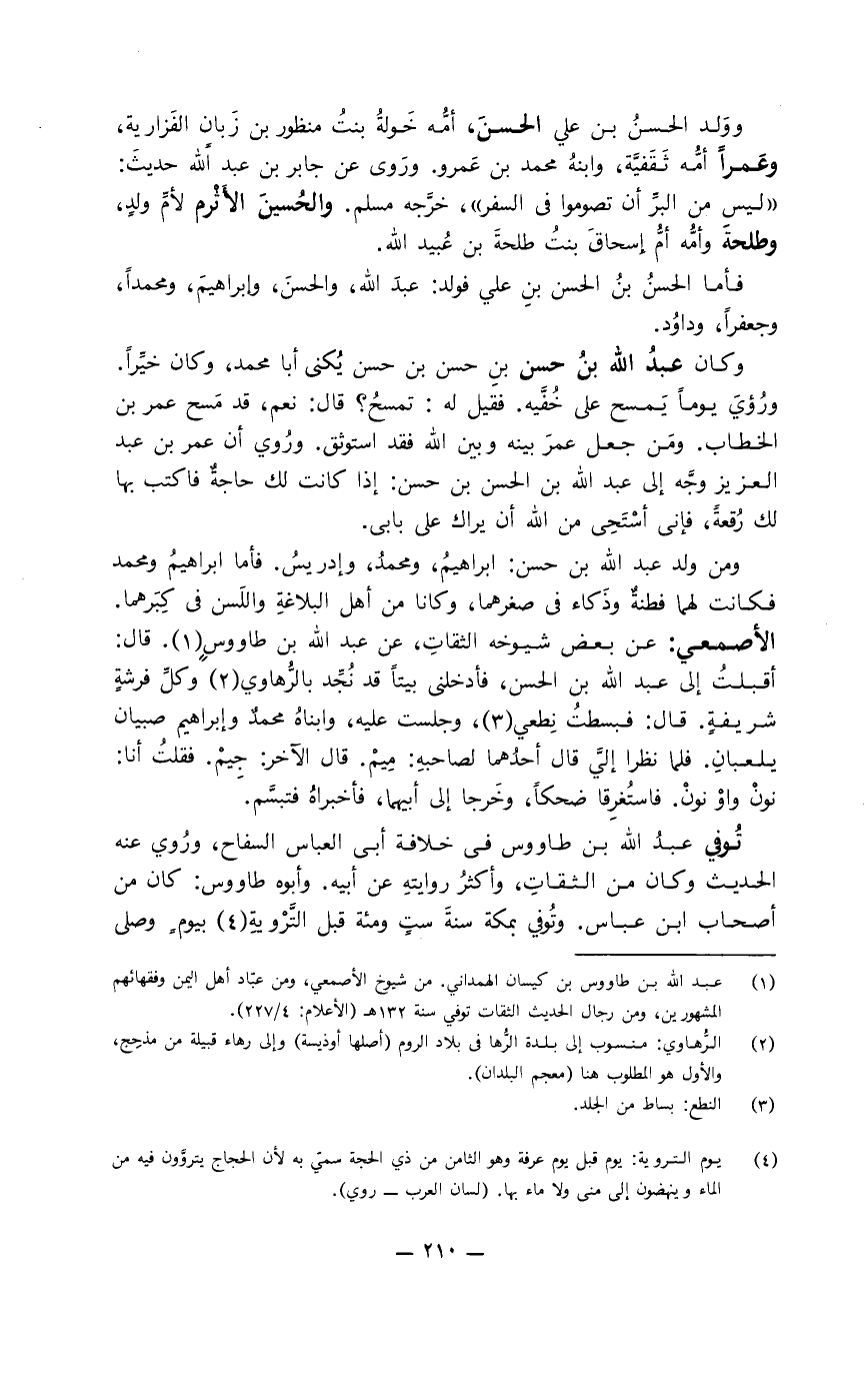 فأما الحسن بنُ الحسن بن علي فولد: عبد الله، والحسن، وإبراهيم ومحمداً، وجعفراً، وداود.