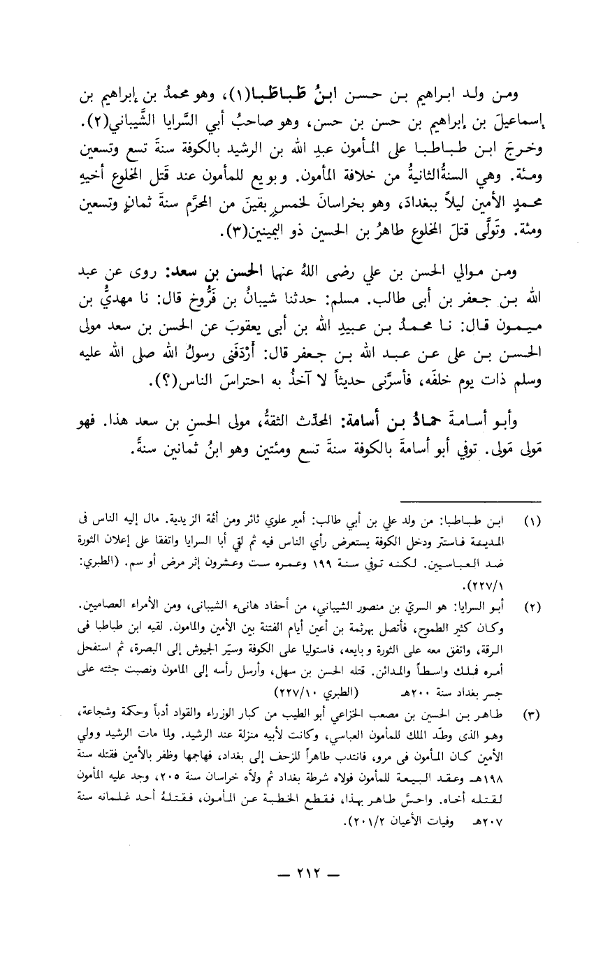 ومن ولد إبراهيم بن حسن ابن طباطبا وهو محمد بن إبراهيم بن إسماعيل بن إبراهيم بن حسن بن حسن، وهو صاحب أبي السرايا الشَّيباني وخرج ابن طباطبا على المأمون عبد الله بن الرشيد بالكوفة سنة تسع وتسعين ومئة. وهي السنة الثانية من خلافة المأمون. وبويع للمأمون عند قتل المخلوع أخيه محمد الأمين ليلاً ببغداد، وهو بخراسان لخمس بقين من المحرم سنة ثمان وتسعين ومئة. وتولَّى قتل المخلوع طاهر بن الحسين ذو اليمينين.