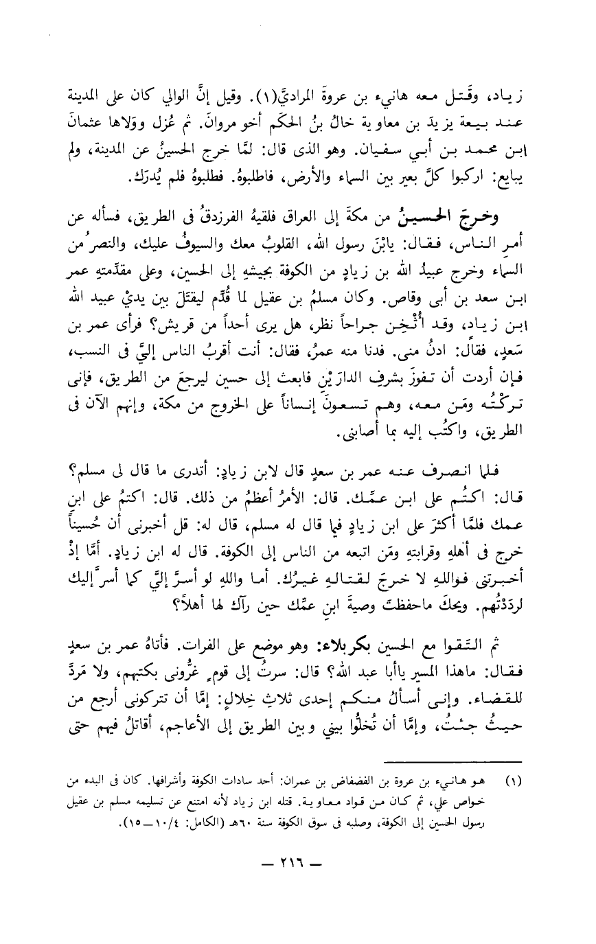وخرج الحسين من مكة إلى العراق فلقيه الفرزدق في الطريق، فسأله عن أمر الناس، فقال: يا ابن رسول الله، القلوب معك والسيوف عليك، والنصر من السماء. وخرج عبيد الله بن زياد من الكوفة بجيشه إلى الحسين، وعلى مقدِّمته عمر بن سعد بن أبي وقاص. وكان مسلم بن عقيل لمَّا قُدِّمَ لِيُقْتَل بين يدي عبيد الله ابن زياد، وقد أُثخِن جراحا نظر، هل يرى أحد من قريش؟ فرأى عمر بن سعد، فقال: ادنُ مني. فدنا منه عمر، فقال: أنت أقرب الناس إليَّ في النسب، فإن أردت أن تفوز بشرف الدارين فابعث إلى الحسين ليرجع من الطريق، فإني تركته ومن معه، وهم تسعون إنسانا على الخروج من مكة، وإنهم الآن في الطريق، واكتب إليه بما أصابني.