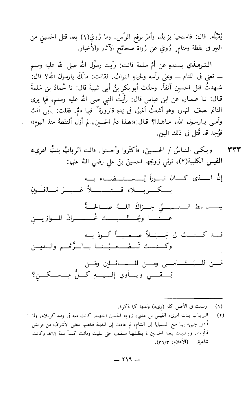 وبكى الناسُ الحسين، فأكثروا وأحسنوا. قالت الربابُ بنتُ امريء القيس الكلبية، ترثي زوجها الحسين بن علي رضي الله عنهما:
