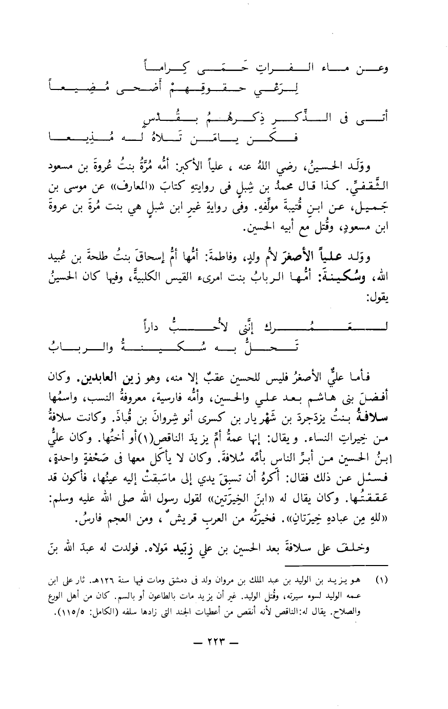 فأما عليٌّ الأصغر فليس للحسين عقب إلا منه، زين العابدين. وكان أفضل بني هاشم بعد علي والحسين، وأمُّه فارسية، معروفة النسب، واسمها سلافةُ بنت يزدجرد بن شهريار بن كسرى أنو شروان بن قُباذ. وكانت سلافةُ من خيرات النساء. ويقال: إنها عمةُ أمُّ يزيد الناقص أو أختها. وكان عليُّ ابن الحسين من أبرِّ الناس بأمِّه سُلافة. وكان لا يأكل معها في صحفة واحدة، فسئل عن ذلك فقال: أكره أن تسبق يدي إلى ما سبقت إليه عينها، فأكون قد عققتها. وكان يقال له " ابنَ الخِيرَتين " لقول رسول الله صلى الله عليه وسلم: " لله من عباده خيرتان ". فخيرتُه من العرب قريش، ومن العجم فارس.