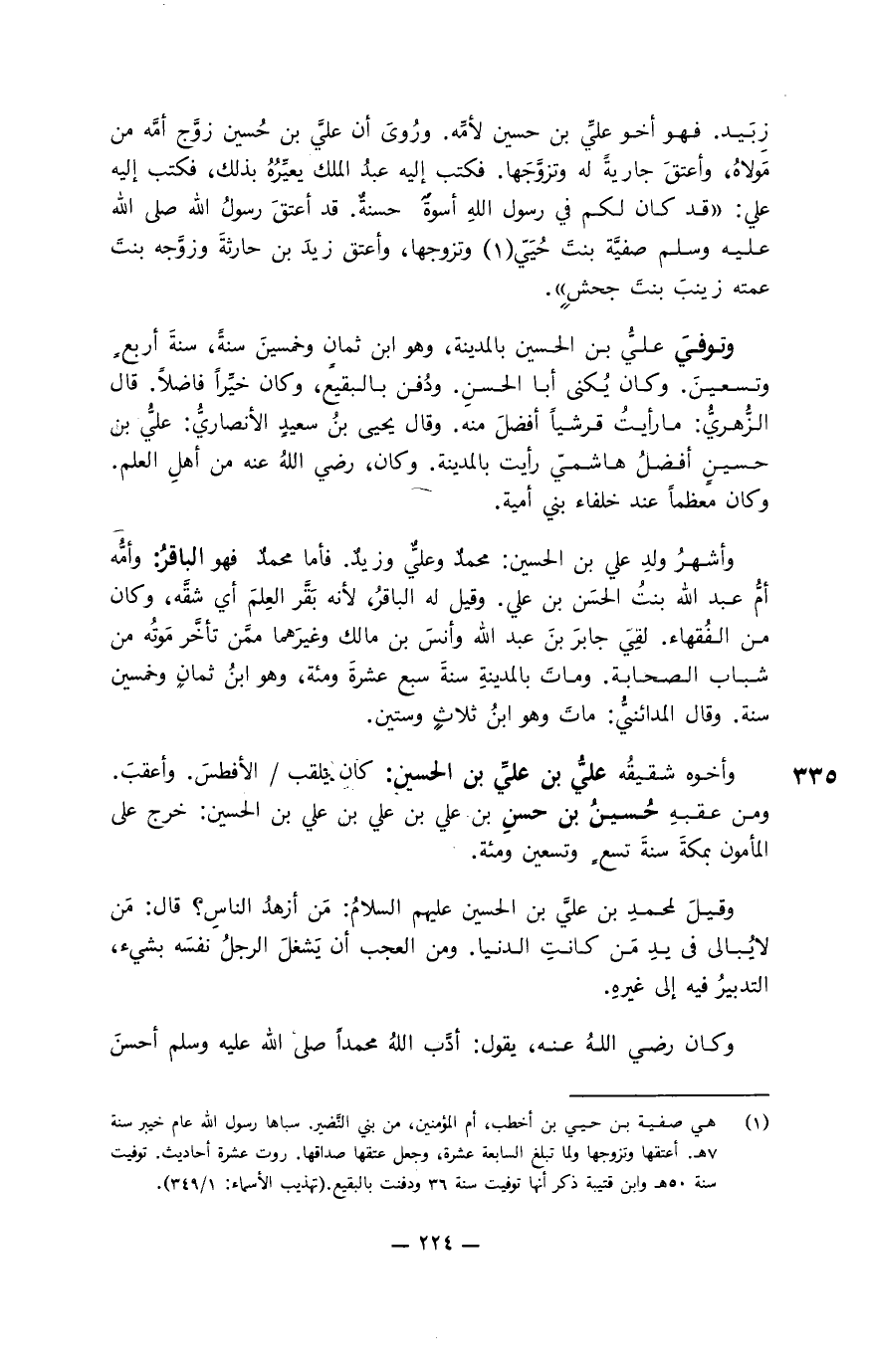 زِبَيد فهو أخو عليِّ بن حسين لأمِّه. ورُوي أن عليَّ بن حسين زوَّج أمَّه من مولاه، وأعتق جارية له وتزوَّجها. فكتب إليه عبد الملك يعيِّره بذلك، فكتب إليه عليِّ: " قد كان لكم في رسول الله أسوةٌ حسنةٌ. قد أعتق رسول الله صلى الله عليه وسلم صفيَّة بنت حُيَيّ وتزوجها، وأعتق زيد بن حارثة وزوَّجه بنت عمته زينب بنت جحش ".