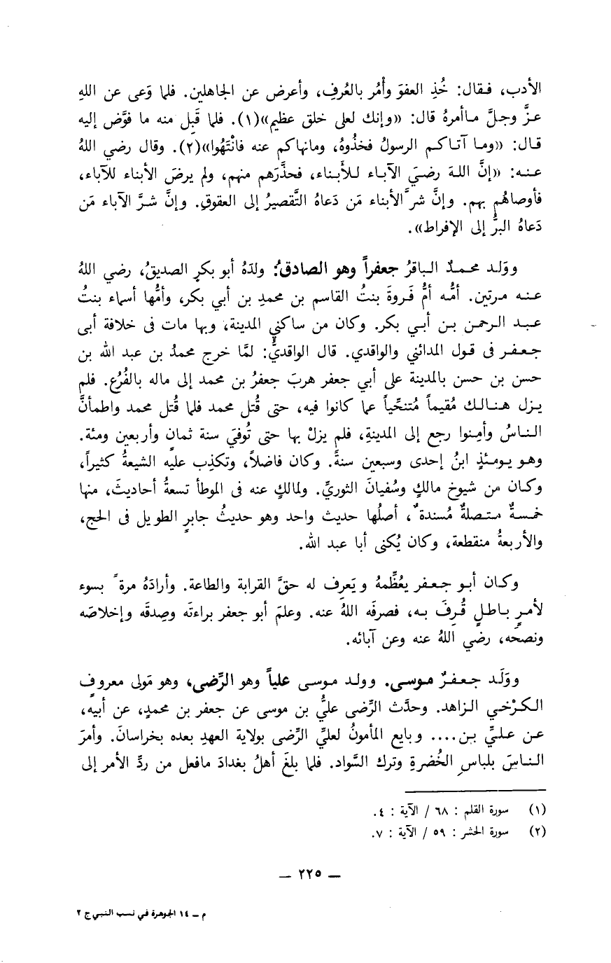 وولد جعفر موسى. وولد موسى عليا وهو الرِّضى، وهو مولى معروف الكرخي الزاهد. وحدَّث الرِّضى عليُّ بن موسى عن جعفر بن محمد، عن أبيه، عن عليِّ بن.... وبايع المأمون لعليِّ الرِّضى بولاية العهد بعده بخراسان. وأمر الناس بلباس الخُضرة وترك السَّواد. فلما بلغ أهل بغداد ما فعل من ردِّ الأمر إلى
