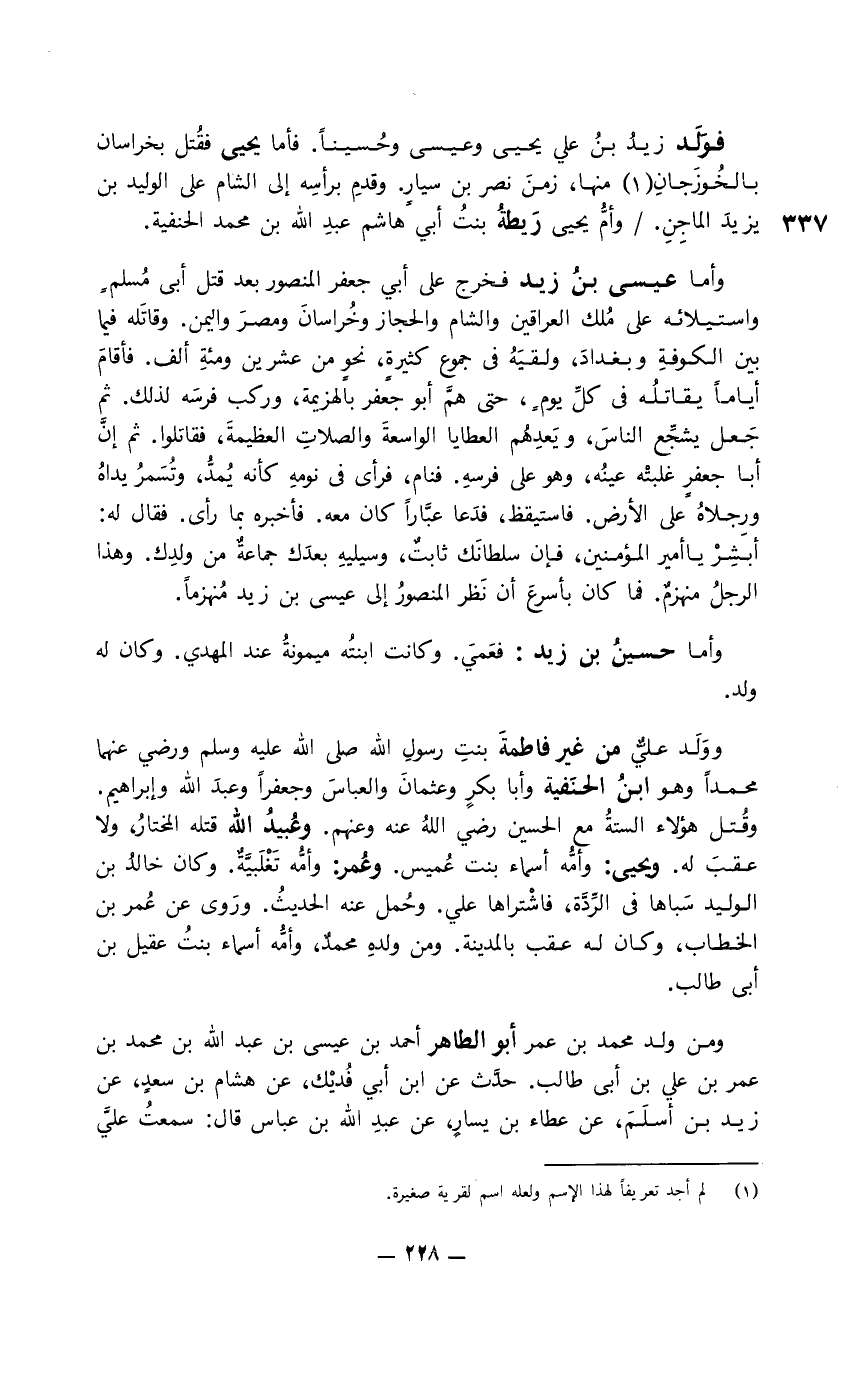 فوَلَد زيد بن علي يحيى وعيسى وحسينا. فأما يحيى فقُتل بخراسان بالخُوزَجان منها، زمن نصر بن سيار. وقدم برأسه إلى الشام على الوليد بن يزيد الماجن. وأمُّ يحيى رَيطةُ بنت أبي هاشم عبد الله بن محمد الحنفية.