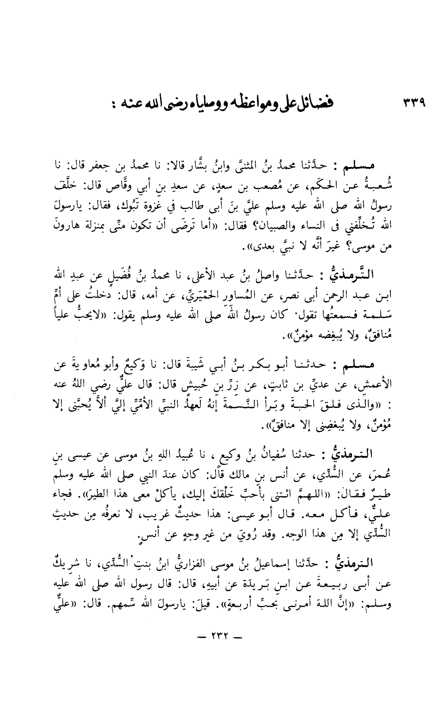 الترمذيُّ حدَّثنا واصل بن عبد الأعلى، نا محمد بن فُضَيل عن عبد الله ابن عبد الرحمن أبي نصر، عن المُساور الحمْيَريِّ، عن أمه، قال دخلت على أمِّ سلمة فسمعتها تقول. كان رسول الله صلى الله عليه ةوسلم يقول " لا يُحب عليا مُنافق، ولا يُبغضه مؤمن ".