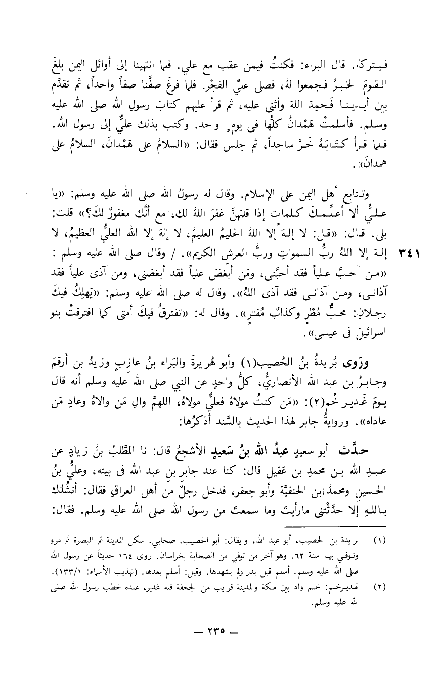وروى بُريدة بن الحُصيب وأبو هُريرة والبراء بن عازب وزيد بن أرقم وجابر بن عبد الله الأنصاريُّ، كلُّ واحد عن النبي صلى الله عليه وسلم أنه قال يوم غدير خُم: " من كنت مولاه فعليٌّ مولاه، اللهمَّ والِ من والاه وعادي من عاداه ". ورواية جابر لهذا الحديث بالسند أذكرها: حدَّث أبو سعيد عبد الله بن سعيد الأشجع قال: نا المطَّلب بن زياد عن عبيد الله بن محمد بن عقيل قال: كنا عند جابر بن عبد الله في بيته، وعليُّ بن الحسين ومحمد بن الحنفيَّة وأبو جعفر، فدخل رجل من أهل العراق فقال: أنشدك بالله إلا حدَّثتني ما رأيت وما سمعت من رسول الله صلى الله عليه وسلم. فقال: