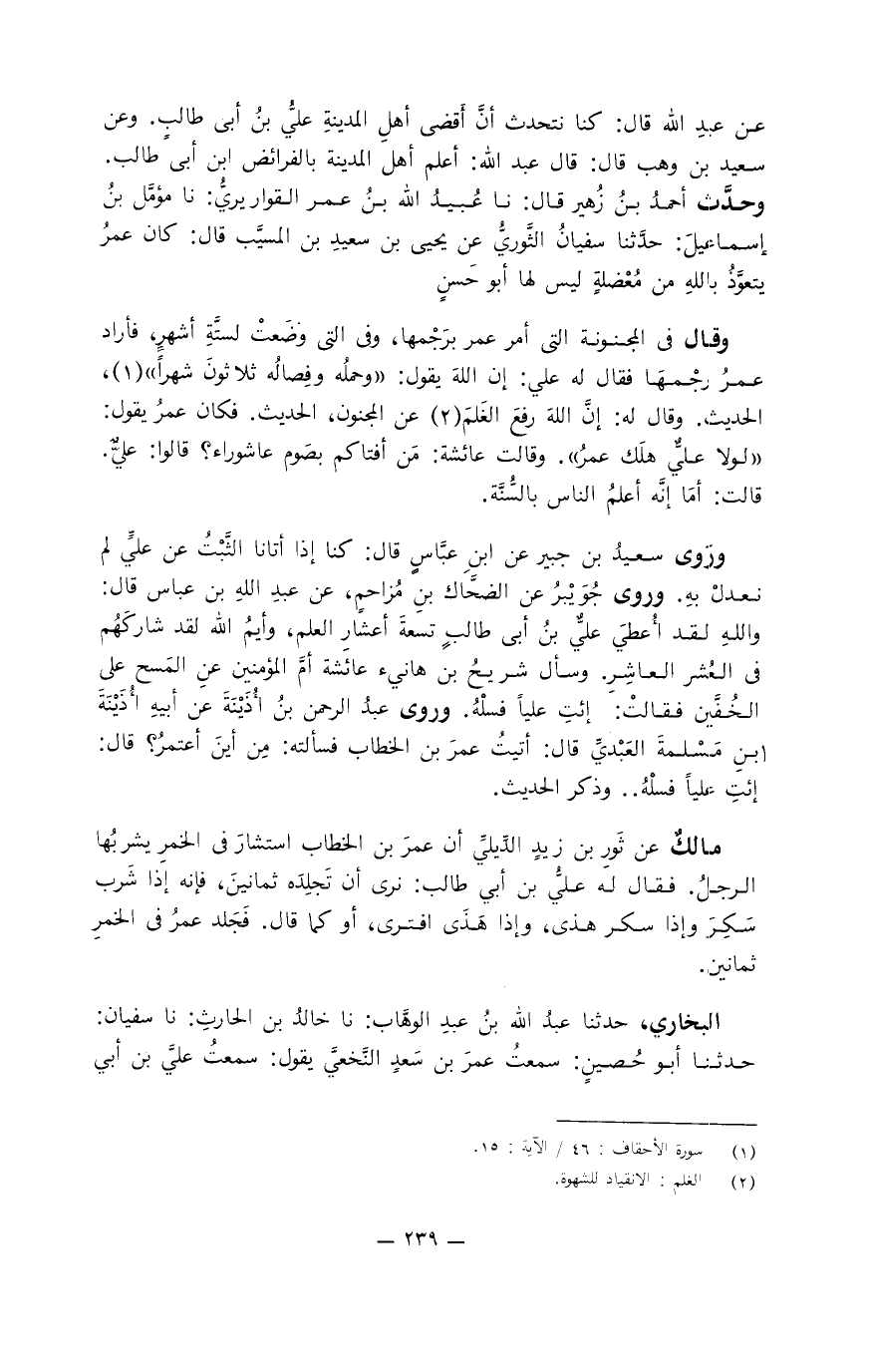عن عبد الله قال: كنا نتحدث أنَّ أقضي أهل المدينة عليُّ بنُ أبي طالب. وعن سعيد بن وهب قال: قال عبد الله: أعلم أهل المدينة بالفرائض ابن أبي طالب. وحدَّث أحمد بن ُ زهير قال: نا عبيد الله بن عمر القواريريُّ: نا مؤمَّل بن إسماعيل: حدَّثنا سفيان الثَّوريُّ عن يحيى بن سعيد بن المسيَّب قال: كان عمر يتعوَّذ بالله من معضلة ليس لها أبو حسن.