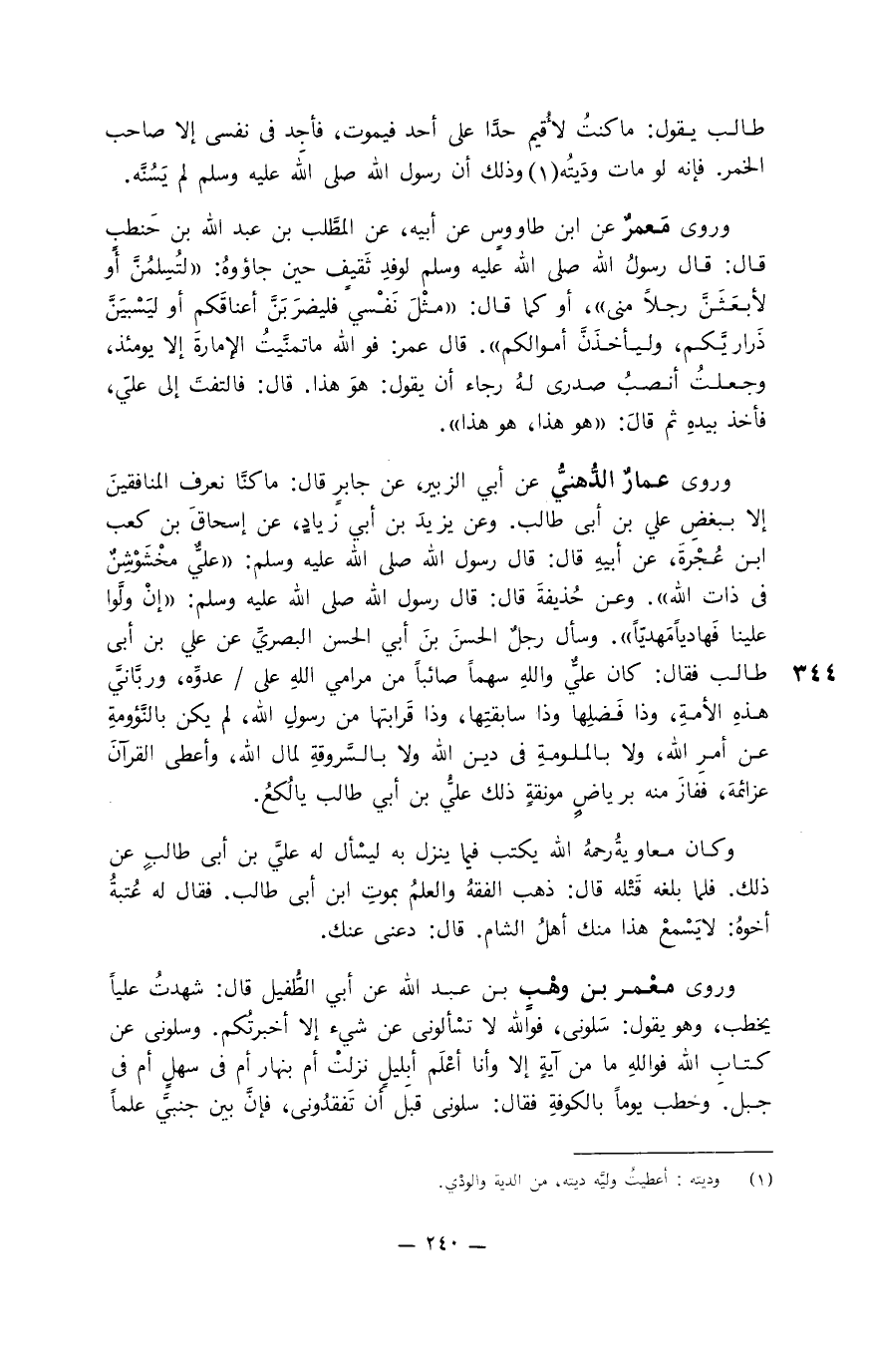 وروى عمار الدُّهنيُّ عن أبي الزبير، عن جابر قال: ما كنَّا نعرف المنافقين إلا ببغض علي بن أبي طالب. وعن يزيد بن أبي زياد، عن إسحاق بن كعب ابن عُجْرَة، عن أبيه قال: قال رسول الله صلى الله عليه وسلم: " عليٌّ مخْشَوْشِنٌ في ذات الله ". وعن حُذيفة قال: قال رسول الله صلى الله عليه وسلم: " إنْ ولَّوا عليا فهاديا مهديّا ". وسأل رجل الحسن بن أبي حسن البصريِّ عن علي بن أبي طالب فقال: كان عليٌّ والله سهما صائبا من مرامي الله على عدوِّه، وربَّانيَّ هذه الأمة، وذا فضلها وذا سابقتِها، وذا قرابتها من رسول الله، لم يكن بالنَّؤومة عن أمر الله، ولا بالملومة في دين الله ولا بالسَّروقة لمال الله، وأعطى القرآن عزائمه، ففاز منه برياض مونقة ذلك عليُّ بن أبي طالب يا لُكع.