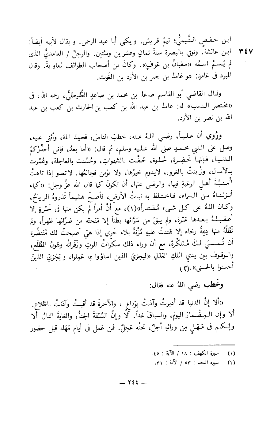 ورُوي أن عليا، رضي الله عنه، خطب الناس، فحمد الله. وأثنى عليه، وصلى على النبي محمد صلى الله عليه وسلم، ثم قال: " أما بعد، فإني أحذِّرُكم الدنيا، فإنها خَضِرة، حُفَّت بالشهوات، وحُسِّنت بالعاجلة، وعُمِّرت بالآمال، وزُينت بالغرور، لا يدوم خيرُها، ولا تؤمن فجائعُها. لا تعدو إذا تاهت أُمنيَّة أهل الرغبة فيها، والرضى عنها، أن تكون كما قال الله عزَّ وجل:) كماء أنزلناهُ من السماء فاختلطَ به نباتُ الأرضِ فأصبحَ هشيماً تَذروهُ الرياحُ وكان اللهُ على كل شيء مُقتدراً (، مع أنَّ أمرا لم يكن منها في حَبْرة إلا أعقبتْه بعدها عَبْرة، ولم يبق من سَرَّائها بطنا إلا مَنَحتْه من ضرَّائها ظهرا، ولم تَطُلَّه منها دِيمة رخاء إلا هَتنتْ عليه مُزْنة بلاء حري إذا هي أصبحت لك مُتَنضِّرة أن تسمي لك مُتَنكِّرة، مع أن وراء ذلك سكرات الموت وزَفَراته وهول المطَّلَع، والوقوف بين يدي الملك العدل) ليجزيَ الذين أساؤوا بما عَمِلوا ويَجْزِيَ الذينَ أحسنوا بالحسنى (.