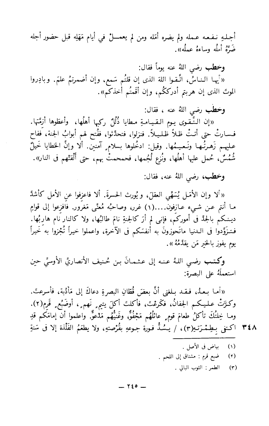 وخطب، رضي الله عنه، فقال: " ألا وإن الأمل يُسَهِّي العقل، ويُورث الحسرة. ألا فاعزِفوا عن الأمل كأشدِّ ما أنتم عن شيء عازِفون ... غرر، وصاحبه مُعنَّى مغرور. فافزعوا إلى قوام دينكم بالجدِّ في أموركم، فإني لم أر كالجنة نام طالبُها، ولا كالنار نام هاربُها. فتزَوَّدوا في الدنيا ما تَحوزون به أنفسَكم في الآخرة، واعملوا خيرا تُجزوا به خيرا يوم يفوز بالخير مَن يقدِّمُه ".