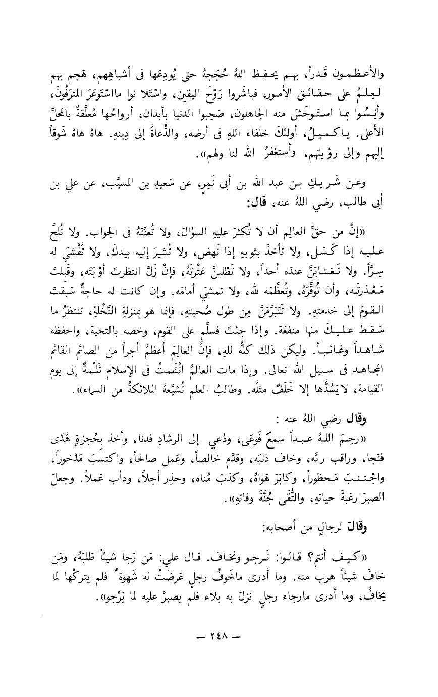 وعن شَريك بن عبد الله بن أبي نَمِر، عن سعيد بن المسيَّب، عن علي بن أبي طالب، رضي الله عنه، قال: " إنَّ من حقِّ العالِم أن لا تُكثر عليه السؤال، ولا تُعَنِّته في الجواب، ولا تلحّض عليه إذا كَسَل، ولا تأخذ بثوبه إذا نهض، ولا تُشير إليه بيدك، ولا تُفشي له سِرّا، ولا تَغتابَنَّ عنده أحدا، ولا تَطلُبَنَّ عَثرتَه، فإن زلَّ انتظرتَ أوبَتَه، وقبلتَ معذِرته، وأن تُوقِّره، وتُعظِّمه لله، ولا تمشي أمامه، وإن كانت له حاجة سَبَقْتَ القوم إلى خدمته. ولا تَتَبَرَّمنَّ من طول صُحبته. فإنما هو بمنزلة النَّخلَة، تنتظر ما سقط عليك منها منفعة. وإذا جئت فسلِّم على القوم، وخصه بالتحية، واحفظه شاهدا وغائبا. وليكن ذلك كله لله، فإن العالِم أعظم أجرا من الصائم القائم المجاهد في سبيل الله تعالى. وإذا مات العالِم انثلمت في الإسلام ثلمة إلى يوم القيامة، لا يسدُّها إلا خَلَفٌ مثله. وطالب العلم تُشيِّعه الملائكة من السماء ".