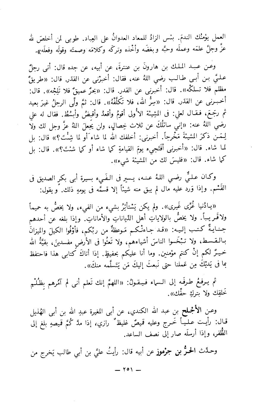 وعن عبد الملك بن هارون بن عنترة، عن أبيه، عن جده قال: أتى رجل عليَّ بن أبي طالب رضي الله عنه، فقال: أخبرني عن القدر. قال: " طريق مظلم فلا تسلكه ". قال: أخبرني عن القدر. قال: " بحر عميق فلا تلجه ". قال: أخبرني عن القدر. قال: " سر الله فلا تكَلَّفْهُ ". قال: ثمَّ ولَّى الرجل غير بعيد ثم رجع، فقال لعلي: في المشيئة الأولى أقوام وأقعد وأقبظ وأبسط. فقال له عليٌّ رضي الله عنه: " إني سائلك عن ثلاث خصال، ولم يجعل الله عزَّ وجلَّ لك ولا لمن ذكر المشيئة مخرجا أخبرني: أخلفك الله لما شاء أو لما شئت؟ " قال: بل لما شاء. قال: " أخبرني أفتجيء يوم القيامة كما شاء أو كما شئت؟ ". قال: بل كما شاء. قال: " فليس لك من المشيئة شيء ".