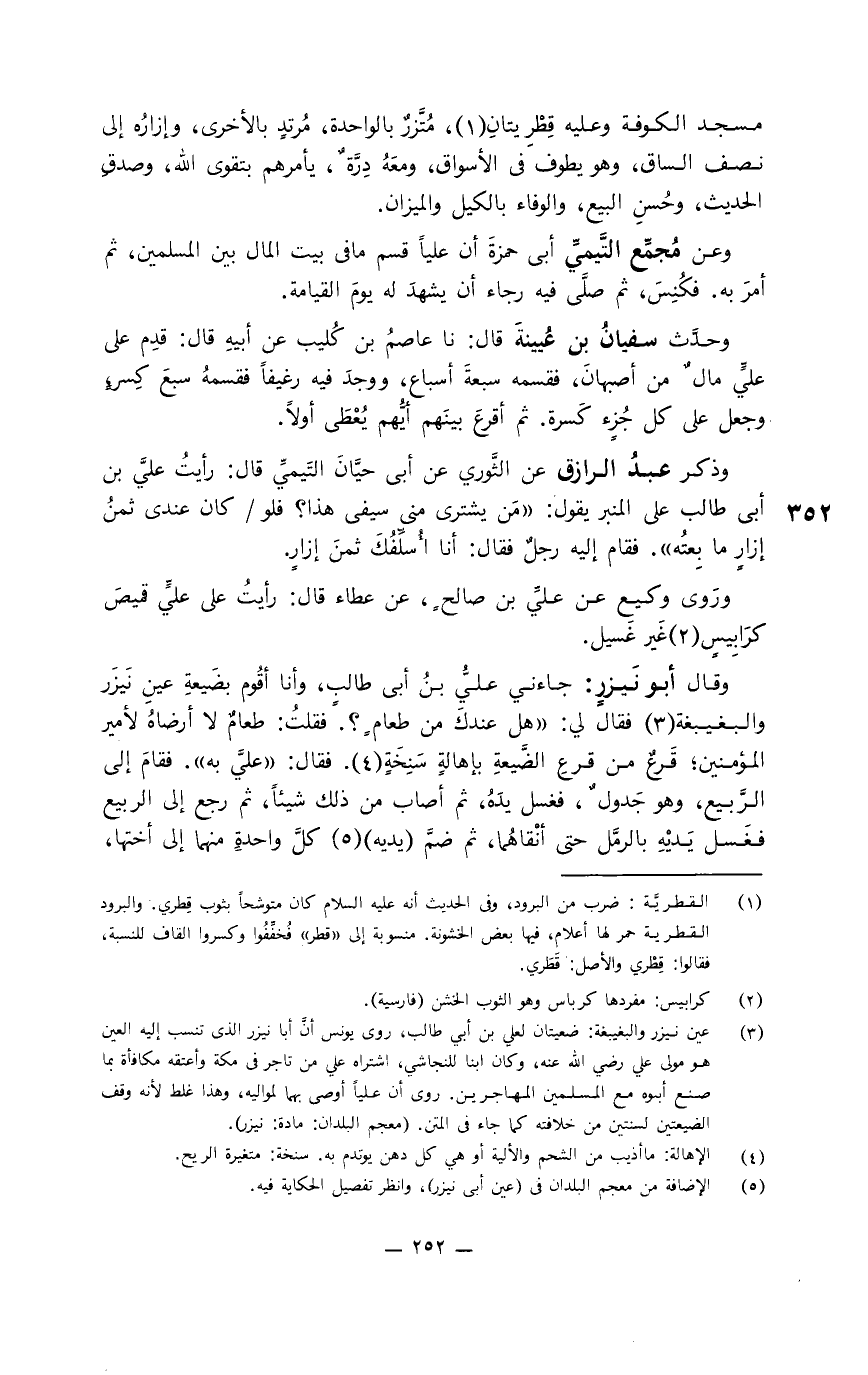 وذكر عبد الرزاق عن الثَّوري عن أبي حيَّا التيميِّ قال: رأيت عليَّ بن أبي طالب على المنبر يقول: " من يشتري مني سيفي هذا؟ فلو كان عندي ثمن إزار ما بعته ". فقام إليه رجل فقال: أنا أسلِّفُك ثمن إزار.