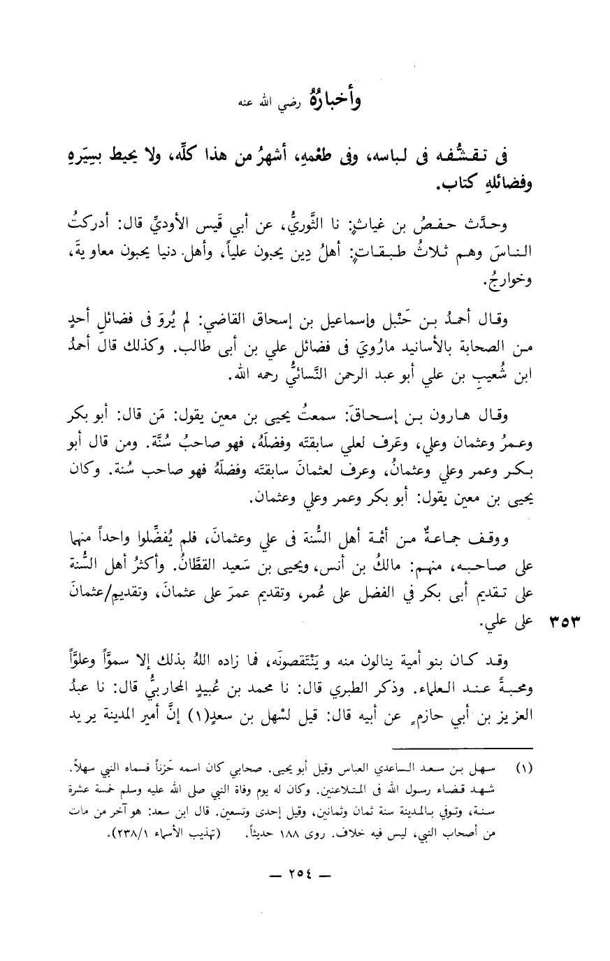 في تقشُّفه في لباسه، وفي طعمه، أشهرها من هذا كلِّه، ولا يحيط بِسِيَرِهِ وفضائله كتاب وحدَّث حفص بن غياث: نا الثَّوريُّ، عن أبي قيس الأوديِّ قال: أدركتُ الناس وهم ثلاث طبقات: أهل دين يحبون عليا، وأهل دنيا يحبون معاوية، وخوارج.