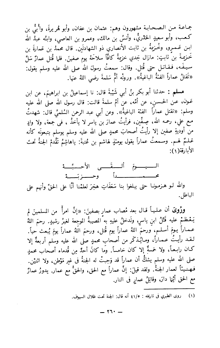 مسلم: حدثنا أبو بكر بن أبي شيبة قال: نا إسماعيل بن إبراهيم، عن ابن عون، عن الحسن، عن أمِّه، عن أمِّ سَلَمة قالت: قال رسول الله صلى الله عليه وسلم: " تقتل عمار الفئة الباغية ". وعن أبي عبد الرحمن السُلميُّ قال: شهدتُ مع علي، رحمه الله، صِفِّين، فرأيت عمار بن ياسر لا يأخذ في جمعة، ولا واد من أودية صفِّين إلا رأيت أصحاب محمد صلى الله عليه وسلم يتبعونه كأنه عَلَمٌ لهم. وسمعت عمارا يقول يومئذ لهاشم بن عُتبَة: يا هاشم تَقدَّم الجنة تحت الأبارقة.